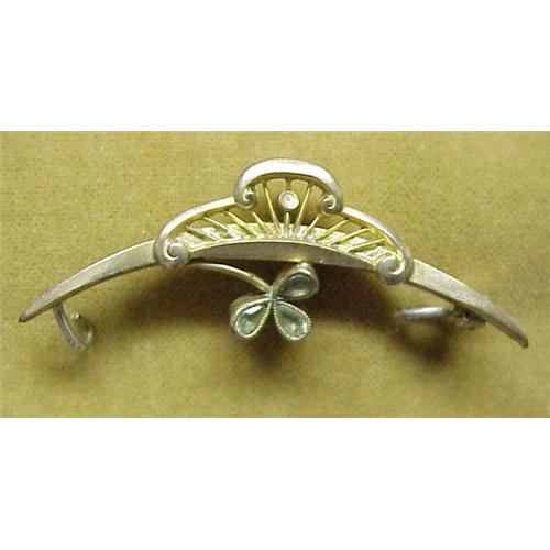 Lovely English detailed brooch, featuring 3 leaf clover set with pretty peridot stones!Not marked and it seems to be gold filled. Excellent condition. Brooch measures about 2" x 3/4", US Buyer please pay 6.00 for shipping plus insrance, We prefer Paypal payments, Thanks for looking!