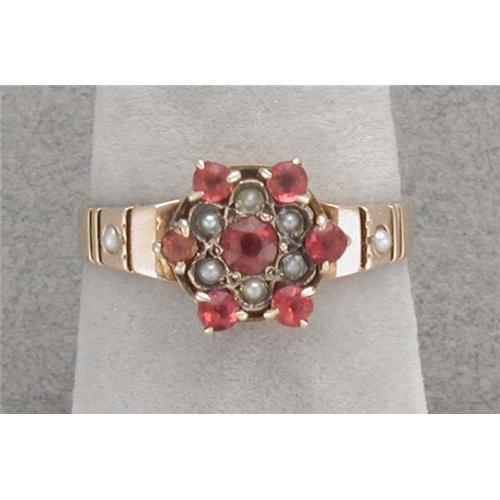 Pretty 10K rose gold (unmarked, but tested) Victorian ring set with one 3MM and six 2MM garnets and eight 1MM seed pearls. It is a size 7 and weighs 1.9 grams.