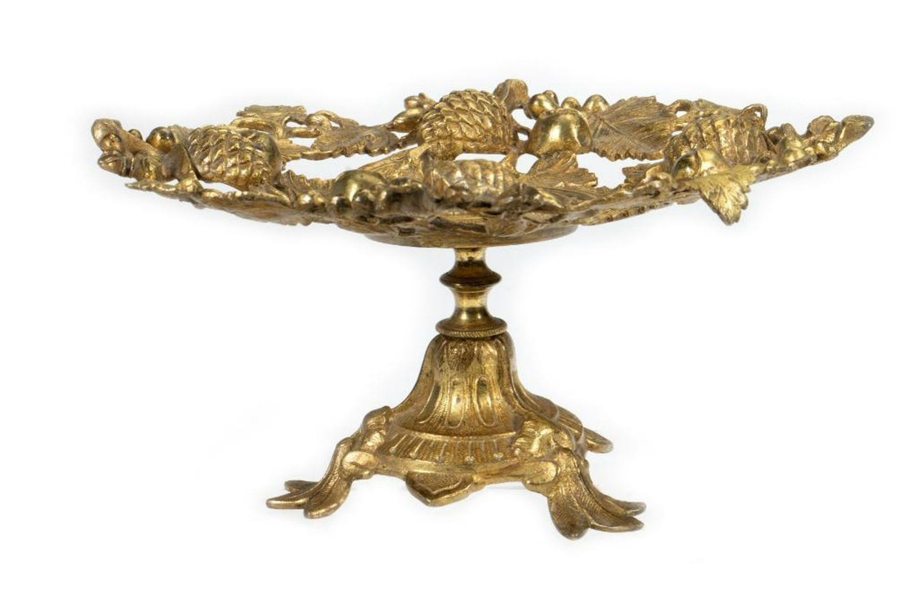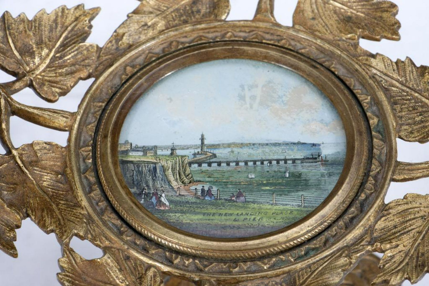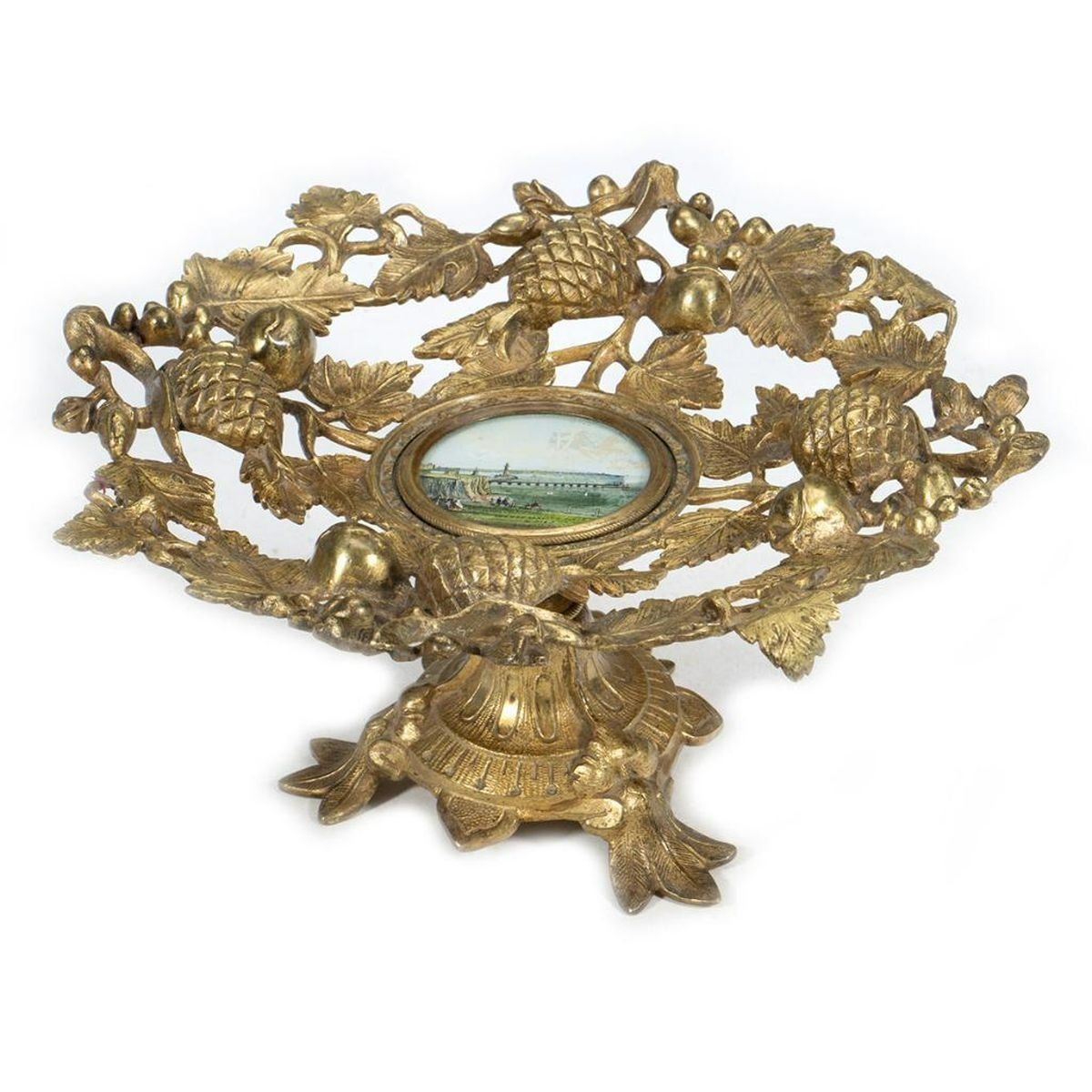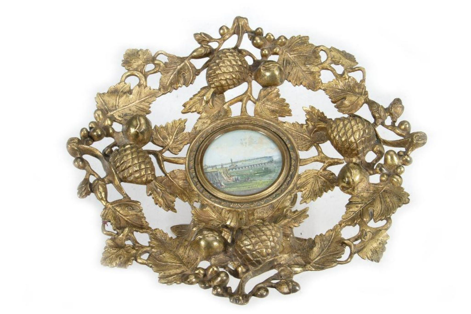 Cast with oak leaves, acorn and pinecones, centering a miniature portrait of 'The New Landing Place and Pier.' 5in. h. Diameter of miniature picture: 2 1/4in. Diameter of bowl. 9 1/2in. Condition: Very good.