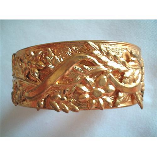 A very stunning gilted brass bangle with a beautifully ornate repousse overlay of leaves, flowers and swirling vines on the front of the bangle. The back is just as pretty as the front with finely etched flowers and leaves, highly detailed and possibly worked by hand. The inside diameter is just under 2-1/2" inches and this lovely bangle will fit any average size wrist quite comfortably. The height is one inch. It has a slide lock close. Slight rubbing on the inside and could use a cleaning but I have left in it's original condition. A fabulous example of Victorian costume jewelry.