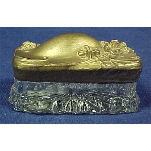 Victorian Glass Dresser Box with gold metal top. Flower design on top. Top has a 1/4 inch dent and minor discoloration. Buyer pays shipping and handling costs.