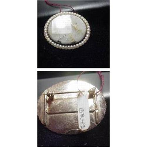 Victorian, Gold-In-Quartz, Pearl, and 14kt yellow gold Brooch in wonderful condition with new pin stem assembly. We think this was at one time either a bracelet center or a shoe buckle, later, expertly converted to a brooch. Please refer to photos. Wonderful piece. Please call for more info or email. We accept visa/mc, by phone