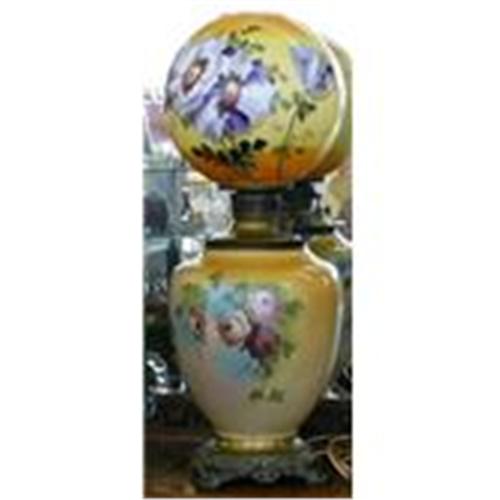 </font></strong>This is a fabulous antique Victorian Gone With The Wind lamp. It features a hand painted flower motif on a yellow background and sits on a bronze base. It is wired for USA use and makes a stunning focal point in any setting. </font>