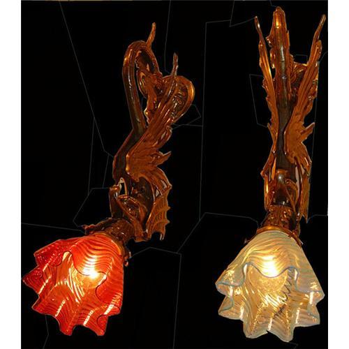 Mythical figures. Elaborate brass work. Beautiful fluted shades. Price is for the pair.