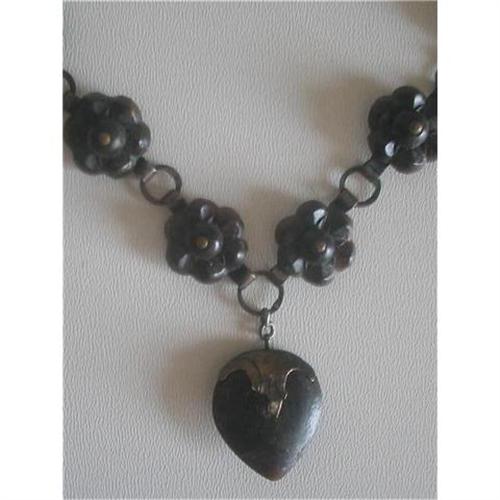 A magnificent and breathtaking example of Victorian Mourning jewellery and craftsmanship. There are nineteen individual stations of small hand carved flowers that have been finely riveted to a silver chain link backing. Each individual flower measures a half inch in diameter. A single heart shaped pendant with silver overlay gives a romantic finishing touch to this stunning piece. The heart pendant measures 1/2" inch wide by almost 3/4" inches in height. Unfortunately, Father Time has created some flaws to this piece, which I will note as follows: One station has been lost and this could be remedied by making the piece shorter. A small portion of the silver overlay on the heart pendant has been lost over time, but is only noticeable under close inspection, and finally, the extender chain and spring ring close is a modern day addition to the piece and not original to the necklace. Relatively minor flaws for a piece of this antiquity. Total length is 17" from clasp to clasp. It is originally from England and has been in my own personal collection for many years.