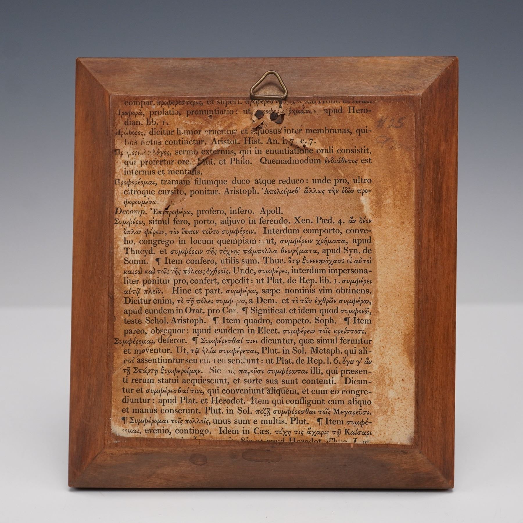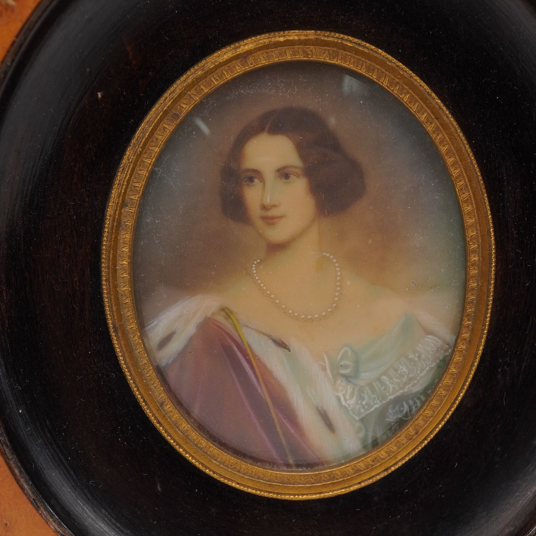 Miniature portrait of a noble lady wearing a pearl necklace and fur-trimmed wrap, finely painted in rich tones and signed Stieler at lower right. Set in a gilt oval bezel and mounted in a polished burlwood frame with ebonized inset. The back features applied Latin and Greek text under the hanging loop. Measures 5.5"L x 6"H.