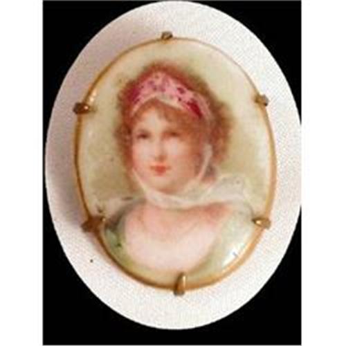Isn?t she just so beautiful?. Thanks to a helpful ebayer I was told this is the Queen of prussia. She wore a loose, flowing scarf for a period of time because she had a slight swelling in her neck that she wanted to hide. People being people, the scarf thing became all the rage. This is 1 1/3" long and she has 18kt gold paint that has highlighted her. This was common back then. The brooch is in very good shape with very gentle wear. The back has lost some of its coloring. This is early 1900?s and not a reproduction. Part is a transfer and part is hand painted.