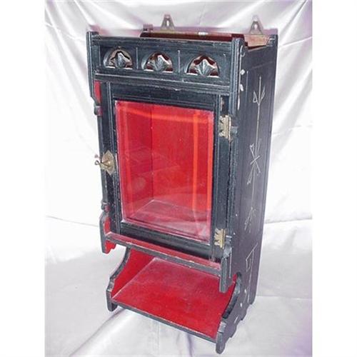 A Victorian hanging cabnet, 23'' tall x 10 3/4'' wide x 8'' deep. Painted black and red with a beveled glass panal in the door, open shelf on bottom. Brass hinges and turn knob, incise carving on sides. Cabinet made to be hung. Paint in fair condition, overall the cabinet is in nice condition, great to display a special item.
