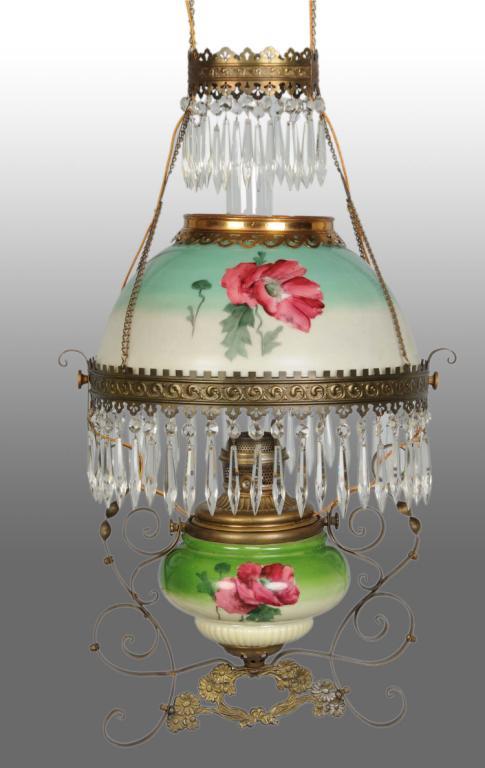 Original shade and front glass prisms hang on two levels. Electrified with adjustable height. Decorative Lamp Condition (Excellent). Size 13" Dia.