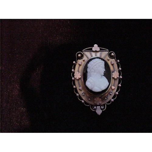 Lovely victorian circa 1880 hardstone cameo "Lady In Profile" 14 Kt yellow gold frame. Applied gold wire work and flowers, scalloped border. Reverse: tube hinge, c-clasp and retractable bail. Great condition.