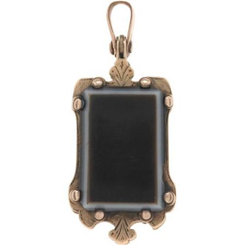 <B>Victorian Hardstone, Gold Locket</B></I><BR><BR>The locket features a rectangular-shaped black hardstone tablet, framed by 14k yellow gold, accented by a rectangular-shaped banded hardstone tablet on the reverse. The locket is completed by a bail. Gross weight 10.00 grams. <BR><I>Dimensions: 1-9/16 inches x 11/16 inch</B></I> <B>Condition Report:</B> Good condition.<BR>The locket opens at the top and has two areas to fill.<BR><BR><b>Shipping:</b> Miscellaneous Collectibles, Smal (<a target="_blank" href="http://www.heritageauctions.com/common/shipping.php">view shipping information</a>)