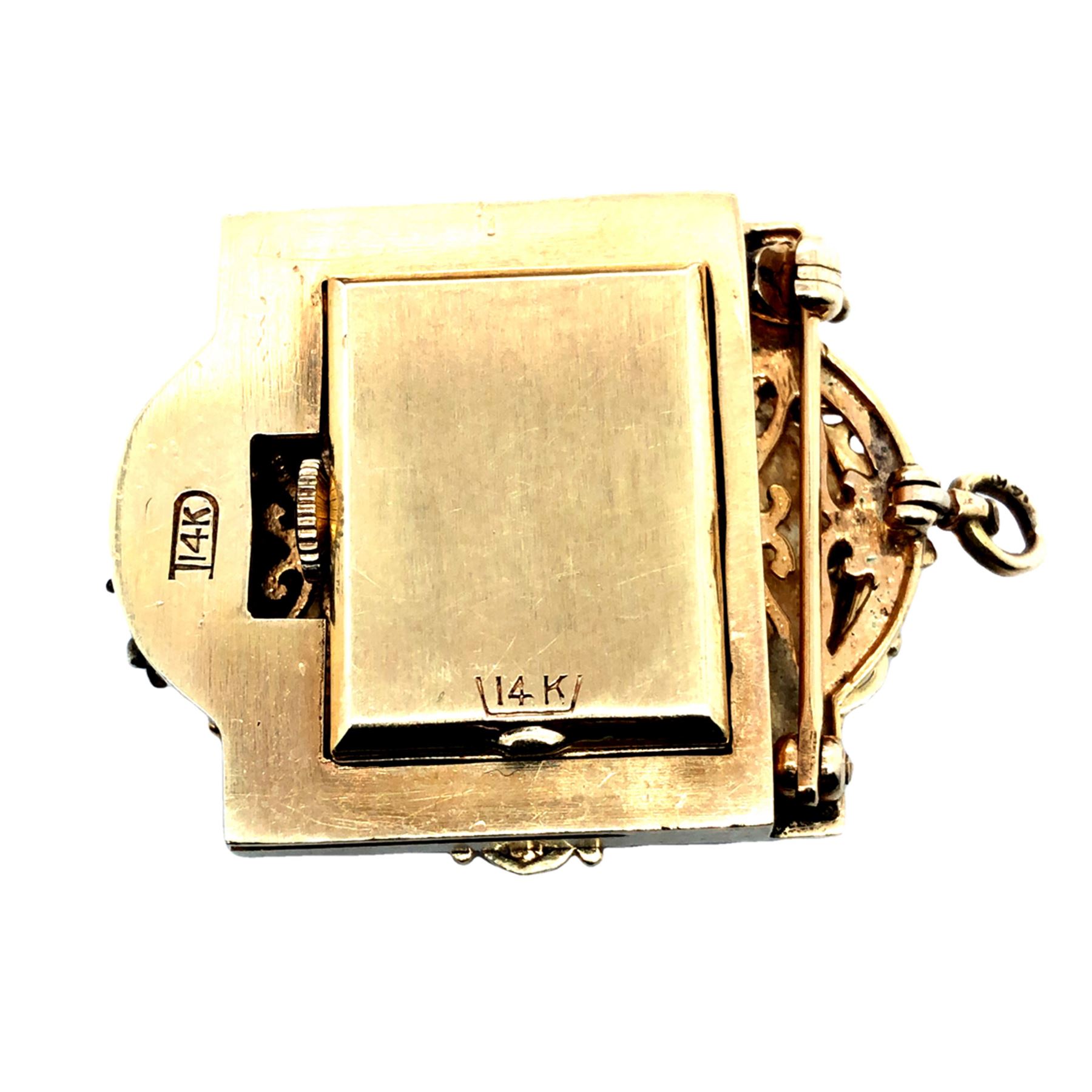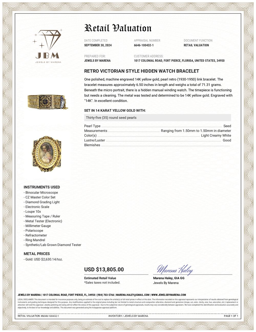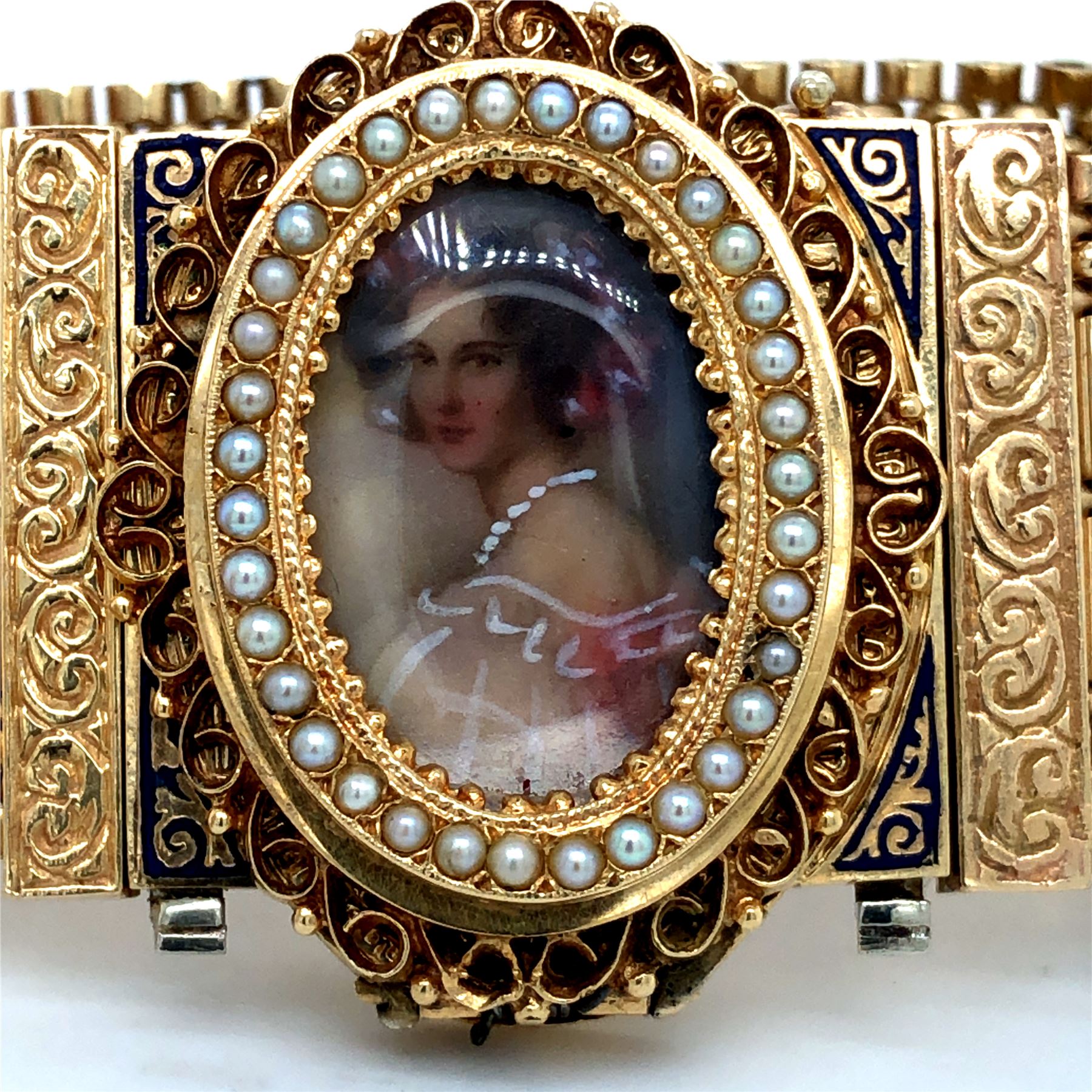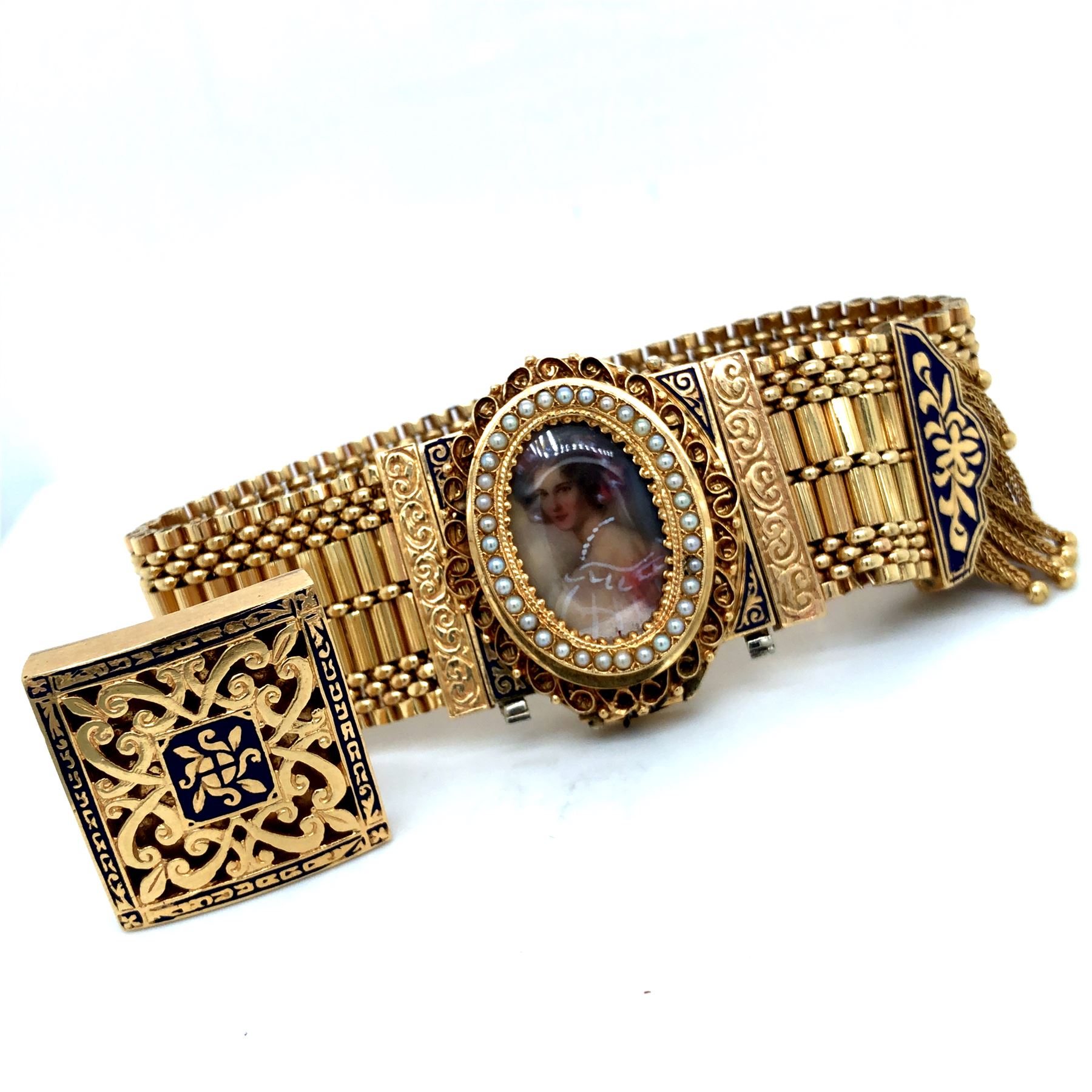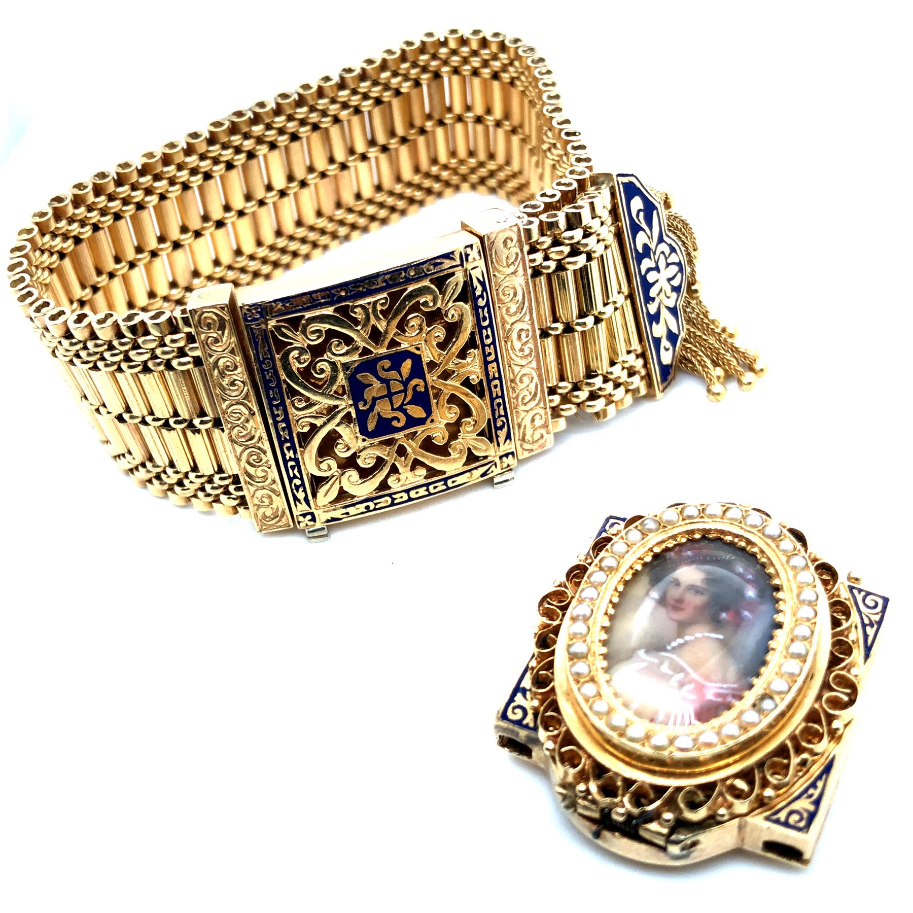 DESCRIPTION DETAIL: More than just a bracelet, this piece has a detachable component that can be worn as a pendant or a pin. The detachable piece features a miniature portrait with a halo of seed pearls around it. Beneath the portrait is a hidden manual winding timepiece.& nbsp;