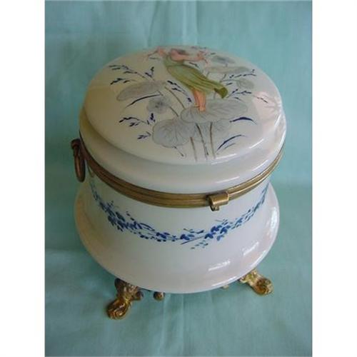 6 1/2 inches Tall ** 5 1/2 inches Across ** Beautiful Opaque Glass with Brass Fittings ** Beautiful Enameled Lady in Green Dress Atop Blue Flowers ** Blue Spray Around Body of Box ** Four Stylized Feet ** Maker Unknown ** Excellent Condition
