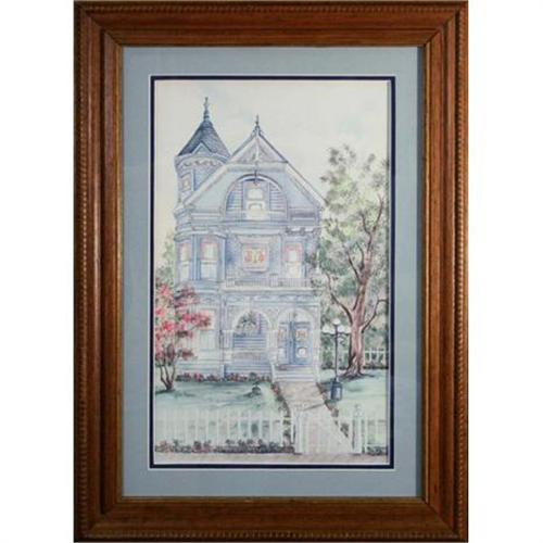 ?Victorian Home? is a beautiful print of a Freeman original watercolor which spotlights the detailed architecture of the late 19th century. A large, three- story house stands proudly in the center of the composition. Every minute detail was articulated with great care, from the stained-glass window panes to the tiny shingle patterns on the second floor. The house is pale blue with white molding accents as well as pink accents on the windows, colors not uncommon in Victorian architecture. A white picket fence lines the front and back yard and a tiny tricycle is even present on the front lawn. The tall trees are dotted with leaves adding delicate depth to the space around the house. The print has been double matted with a deep royal blue bottom and medium dusty blue top layer which emphasize the ...