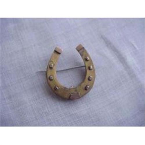 Beautiful Victorian circa 1880 s gilt horseshoe brooch! This good luck horseshoe brooch has raised rose gold tops and the metal is gilt. The brooch has the original Victorian c catch closure and is in wonderful condition ( I have left it with the original patina, it can be polished if desired).. It is a large brooch measuring about 1- inches by 1- inches. A lovely equestrian brooch to enjoy wearing or adding to one s Victorian horseshoe collection. Please be assured all of our items are smoke free, perfect for gift giving or immediate use. Thanks and enjoy your day!