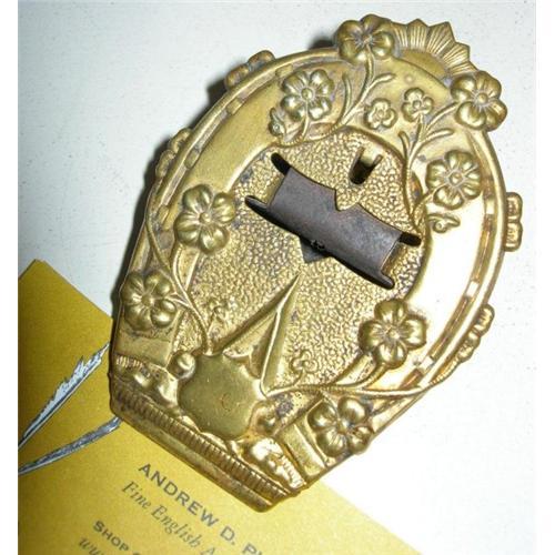 Perfect for the horse lover is this wonderful and very decorative horseshoe letter or paper clip, one of the most attractive I have seen.<p>The spring remains strong and works perfectly. <p>The horseshoe is decorated with repousse flowers and a shield shaped cartouche at the bottom which could be engraved if desired.<p>A very stylish way to store business cards on the desk-top.<p>English c. 1890, it remains in excellent condition. Measures 4 1/4" x 2 1/2" at widest point.