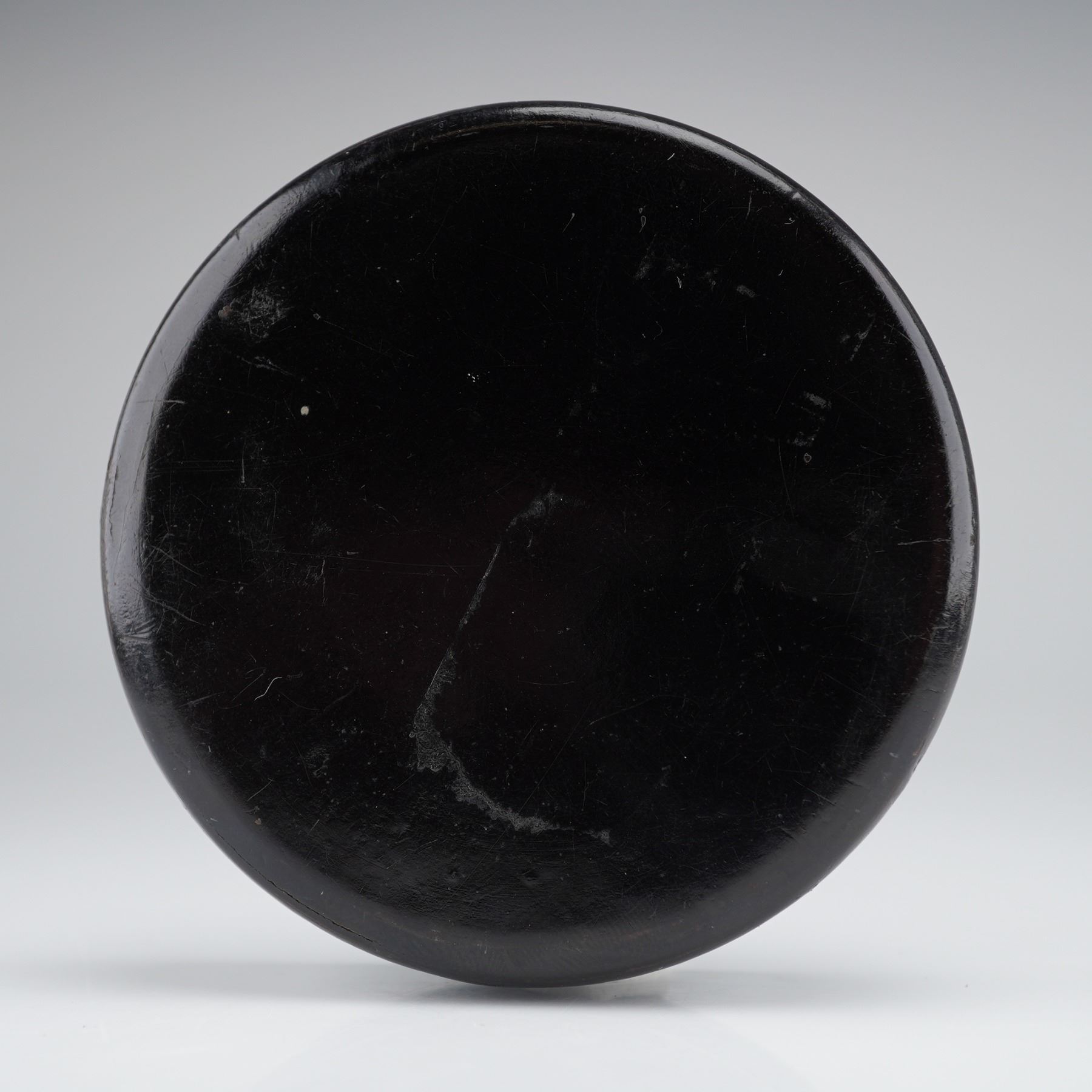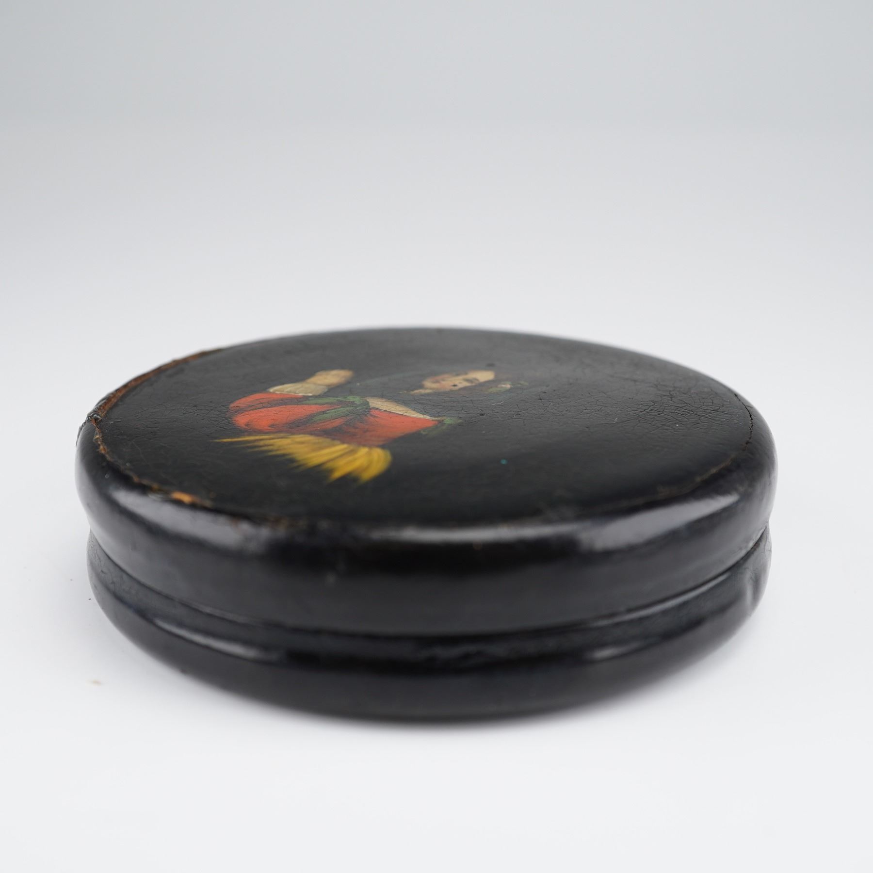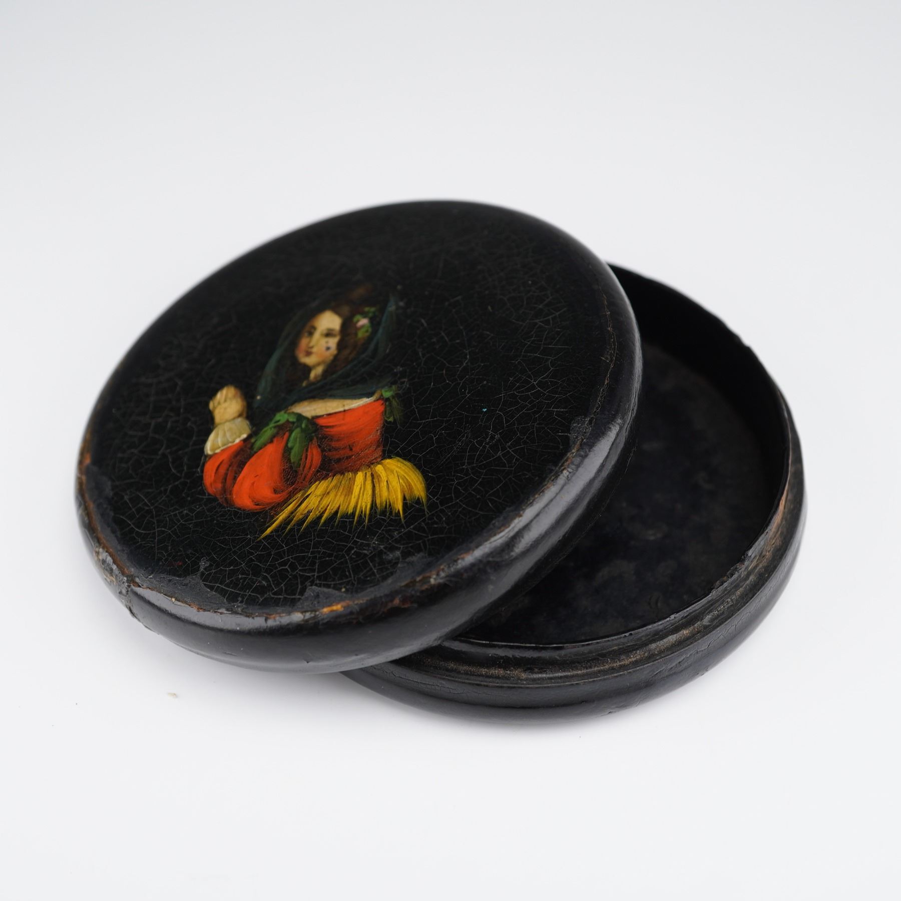 A single circular, lidded container, identified through market research and visual inspection as a Victorian lacquered wood snuff box. The object is constructed from black lacquered wood or papier-mache, characteristic of 19th-century folk lacquerware. The lid is decorated with a hand-painted miniature portrait of a woman, depicted in a bust-length pose. She wears a colorful orange and yellow bodice and a dark shawl, with her hands positioned near her chest.