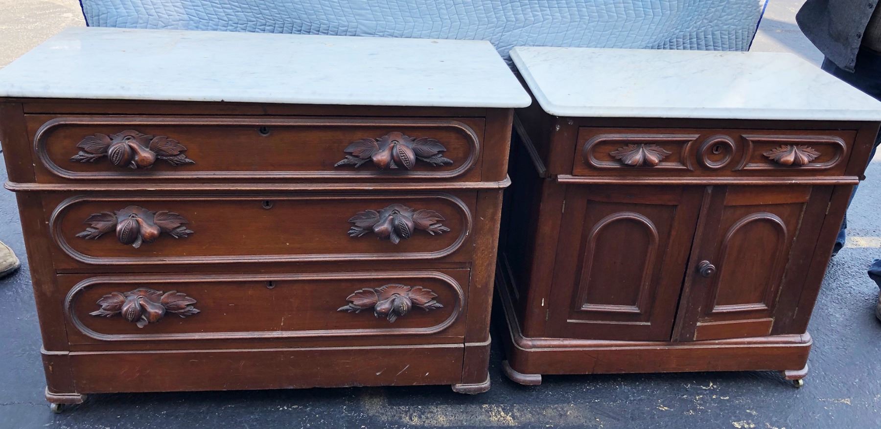 Victorian Walnut Ladies dresser and matching commode with white marble tops,. Unbelievable matching pieces, dresser has 3 drawers and carved nuts and leaves handles, 2 door mataching commode.