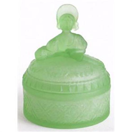 <tr><td>Title:Victorian Lady Frosted Green Glass Powder Jar</td></tr>