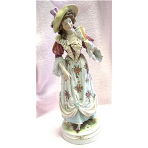 THIS IS A VICTORIA LADY WITH A FAN MARKED GERMAN PORCELAIN FIGURINE. HARD PASTE PORCELAIN. THE BOTTOM IS MARKED WITH A SET OF BLUE CROSSED SWORDS INDER GLAZE. THE BOTTOM IS ALSO STAMPED "GERMANY" IN BLUE. NO BREAKS OR CRACKS. THE FIGURINE IS IN VERY GOOD CONDITION WITH THE EXCEPTION OF IT NEEDING TO BE CLEANED PROFESSIONALY/. THANKS FOR LOOKING. ANY OTHER QUESTION, JUST EMAIL ME.