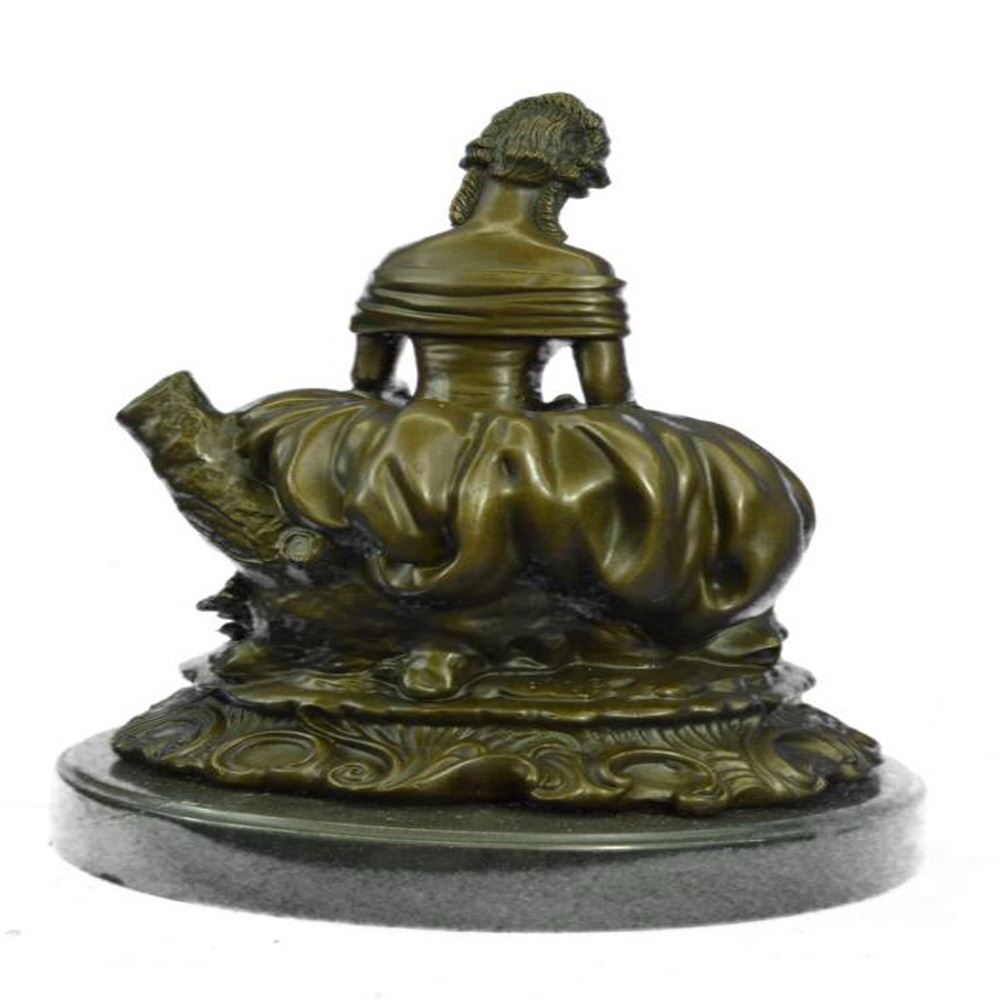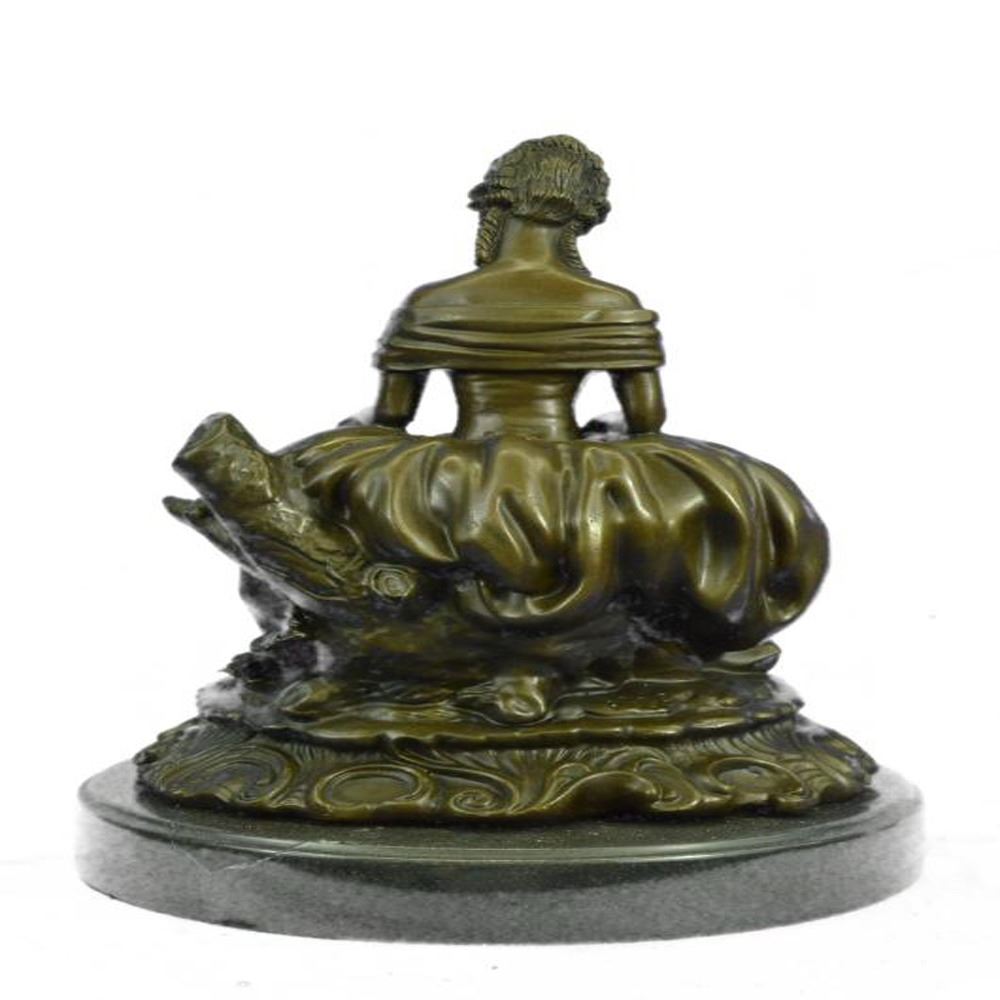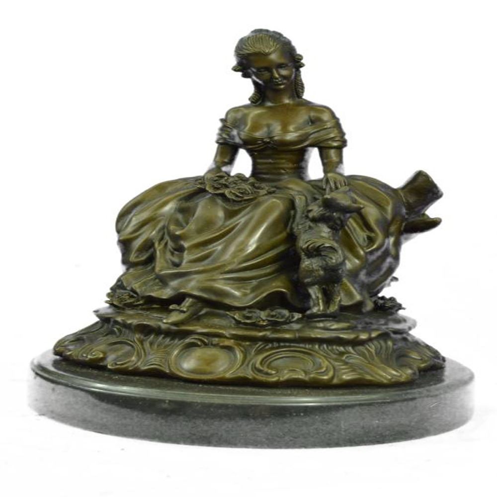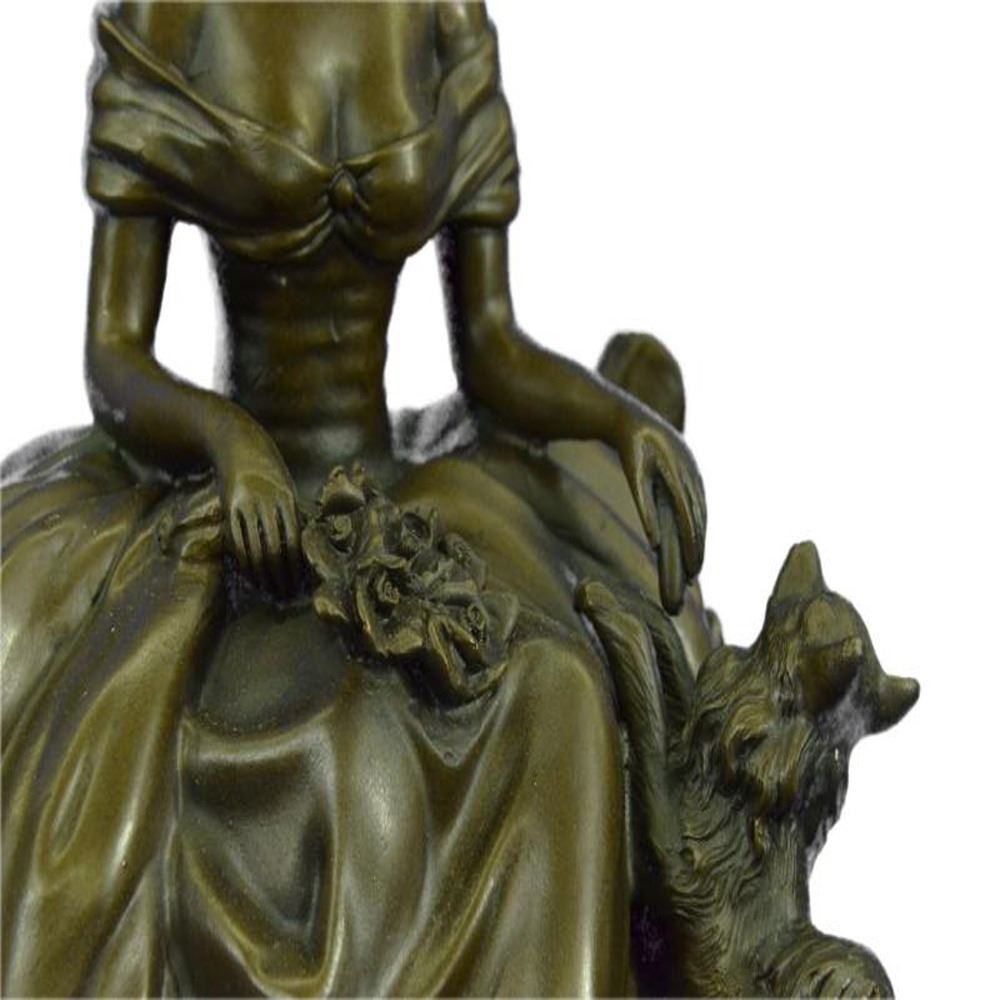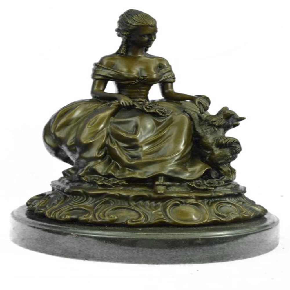 This Is A Wonderful Statue Of A Woman With Her Dog. The Woman Is Middle Aged And Fancily Dressed. She Is Wearing A Long Beautifully Detailed Dress That Hangs From Her Shoulders And Has A Broach Under Her Bosom. Around Her Waist Her Dress Is Gathered Giving Her Form More Curves, Each Crease Detailed With A Pattern. On Her Thigh Is A Clip That Again Holds Up The Fabric Of Her Dress, Revealing Her Slender Leg And Bare Feet. Her Hair Is Wavy And Gathered In A Bun That A Braid Hangs From To Her Shoulders. Her Eyes Are Closed And She Has The Look Of Relaxation While Her Right Hand Fans Her Face With A Feather. Staring Upwards At Her Is A Loyal Creature, An Egyptian Pharaoh Dog, Slender With Pointed Ears, Her Hand Reaches Near Him And He Leans To Embrace The Affection. Handmade Using The Lost Wax Method And Made of Bronze With A Brown Patina. Bronze Dimensions with Marble Base: Height 14 X Width 10 inches. Weight: 27 LBS.