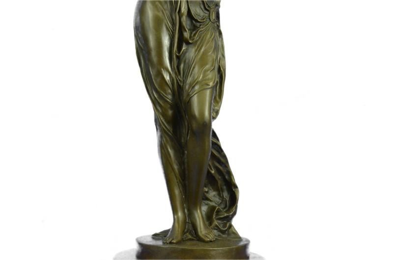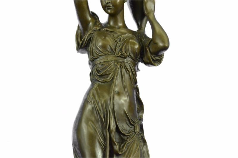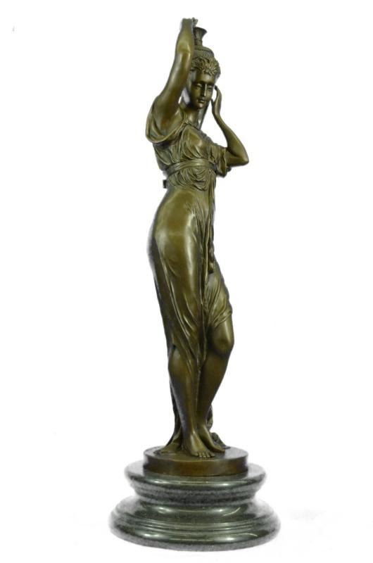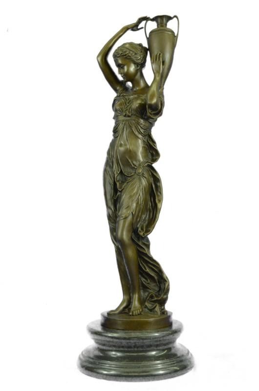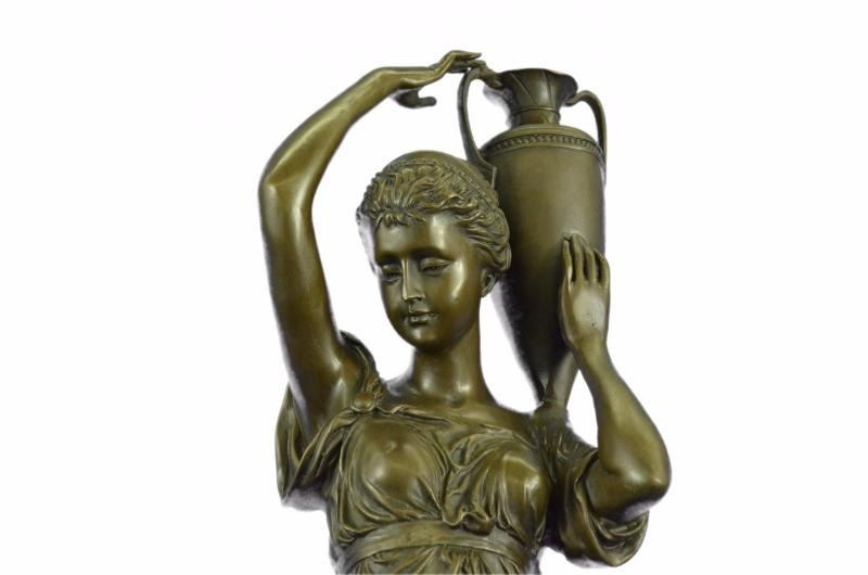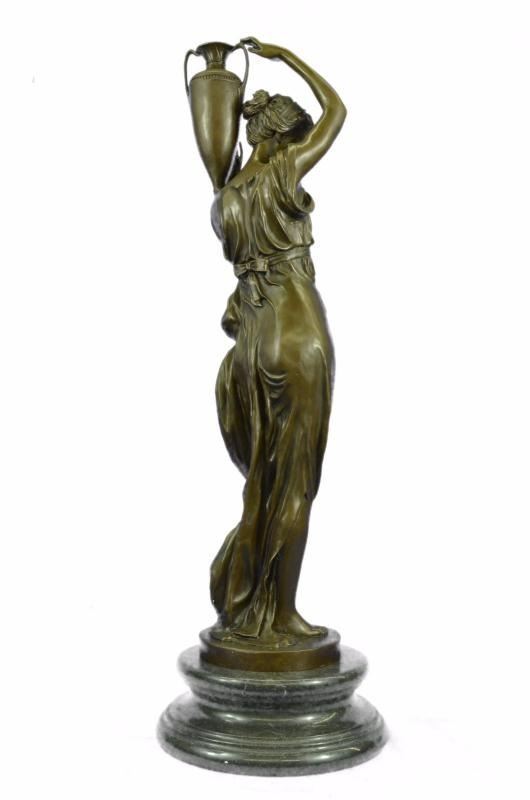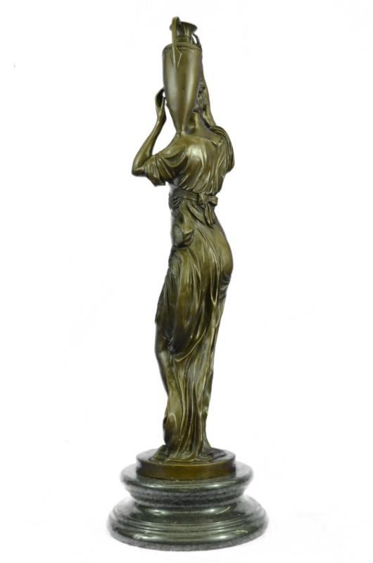 This statue is a conceptual representation of a Victorian woman standing. She carrying and holding a water jug in her hand. She is clearly deep in thought, as her stern gaze stays fixed on a point ahead of her. Her hair cascades beautifully behind her in a manner that is actually fused with the structure of her body. This piece is slightly conceptual, as it focuses more on form rather than detail, as seen in the nonexistent details of her face, but that fact does not take away from the beauty of this piece. It features the lost wax method of casting, founded thousands of years ago, ensuring an exquisitely detailed sculpture, that will add grace and beauty to your business or home. Dimensions: Height 28 X Width 9 inches. Weight: 35 LBS.