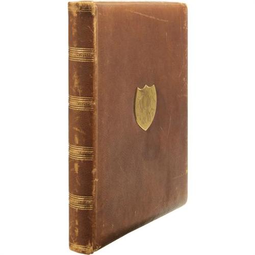 <B>Victorian Leather Album with Hand Colored Illuminations</B></I> - 6 pages, 4to (9.75" x 12"). The fully illuminated pages feature letters and decoration, detailed drawings surrounding calligraphy text, in watercolor or tempera, highlighted in gold. Binding is full brown leather with spine stamped with gilt stamping in a geometric motif, cover has a gilt shield with intricate entwined engraved initials "T M W", edges rubbed, spine rubbed head, tail and portions in between. Album end boards and free end papers are cream silk brocade pattern, gilt stamping on all board edges. Fine condition.<BR><BR><b>Shipping:</b> Books & Catalogs (<a target="_blank" href="http://www.heritageauctions.com/common/shipping.php">view shipping information</a>)