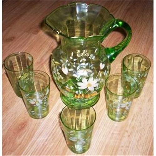 Lovely uranium green lemonade set from the Victorian era. These are attributed to Fenton as well