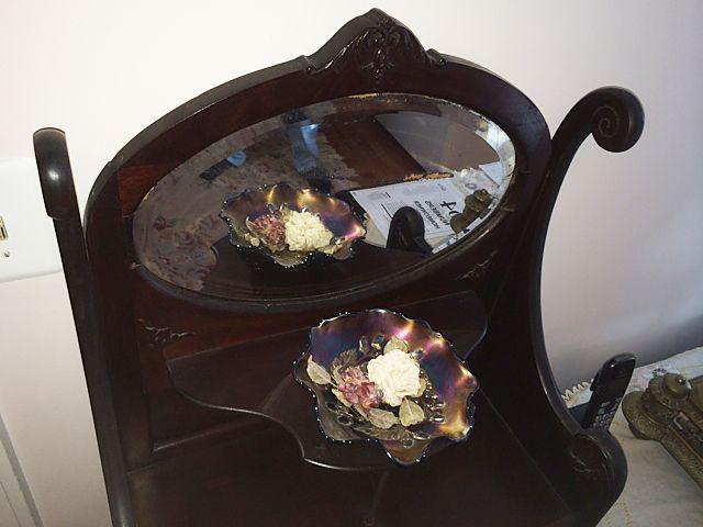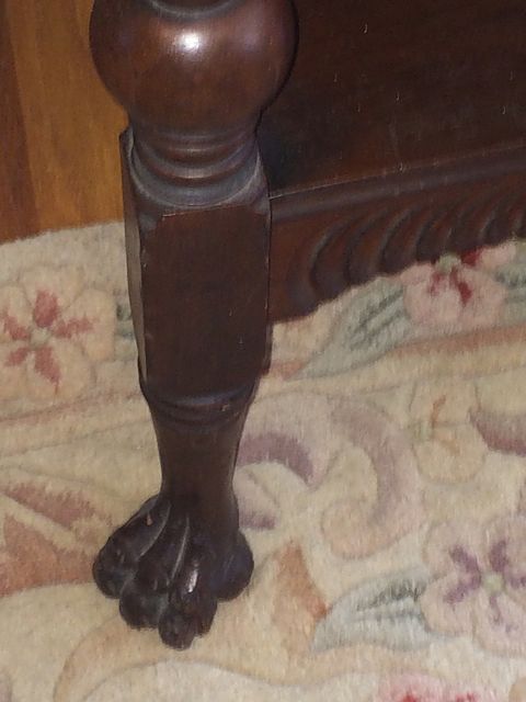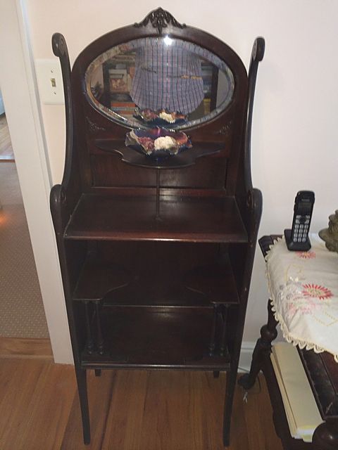Victorian Mahogany Music Cabinet. Single cupboard door and paw feet with beveled oval mirror. Could be used as curio stand.