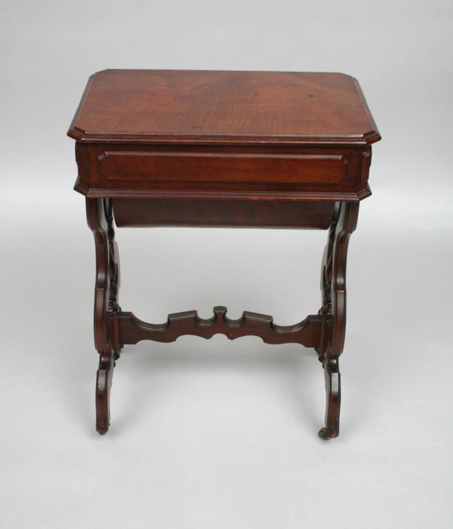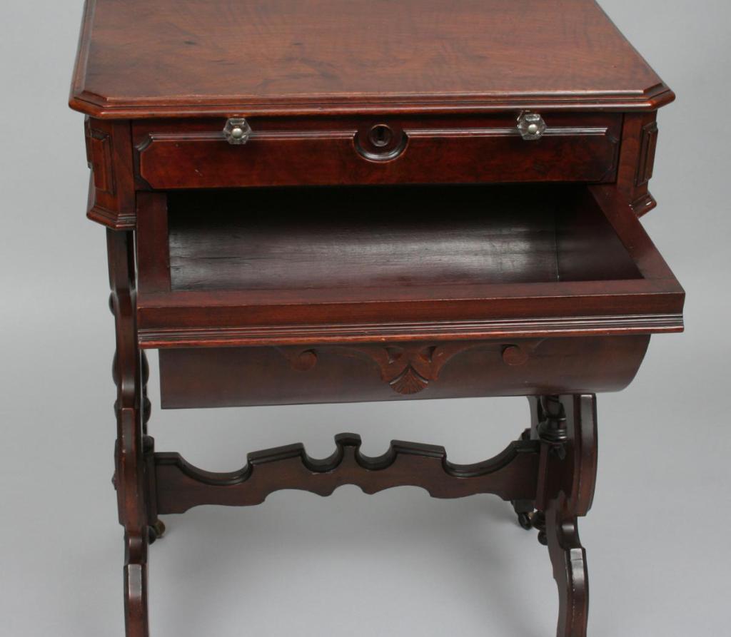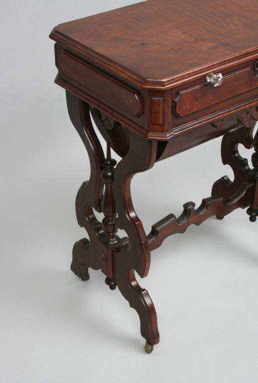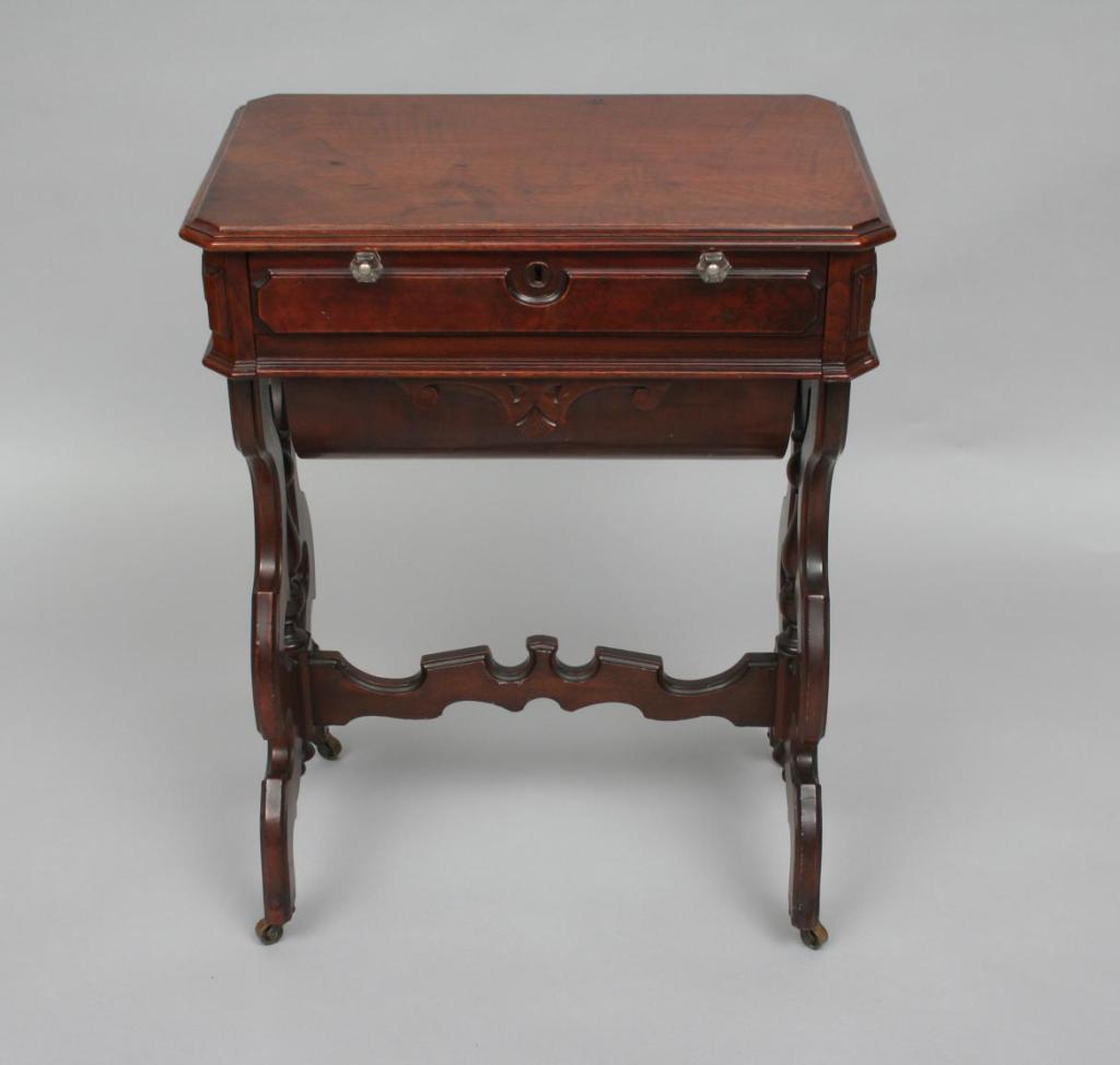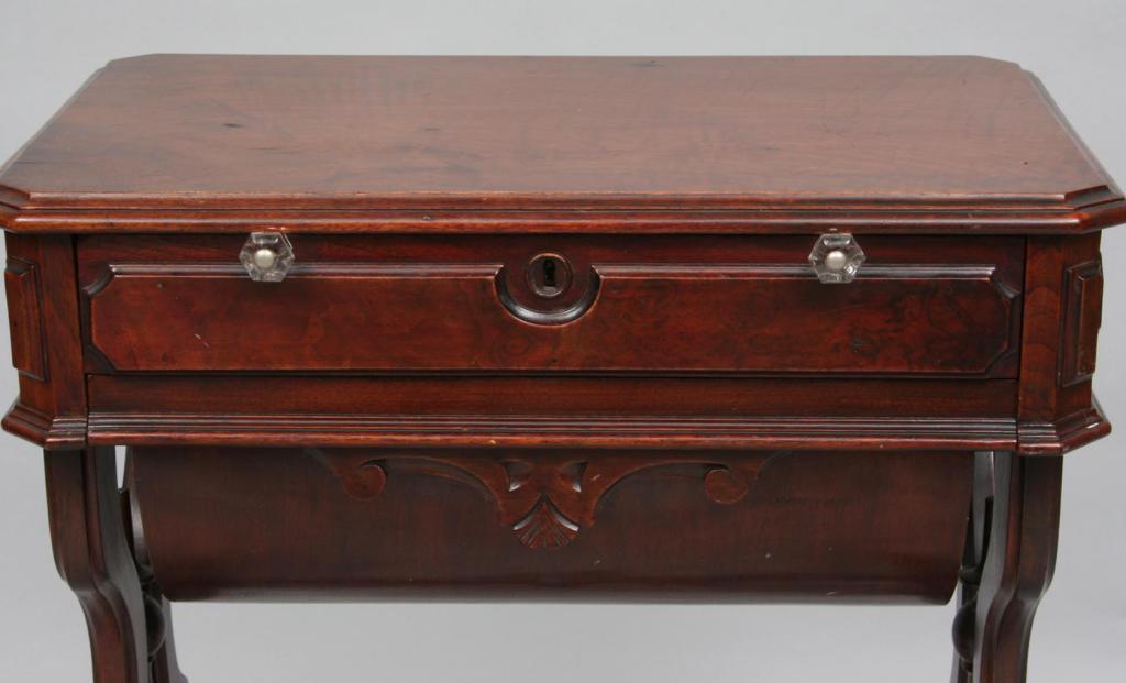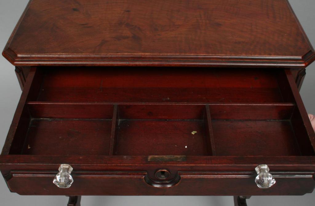 The squared top over a single drawer fitted with compartments, cylindrical body, raised on scroll carved legs connected by a stretcher shelf. 30 1/4"H. 23 1/4"W. 11 1/2"D. Condition: good, some light surface imperfections, including light scratches and light scuffs, generally good.