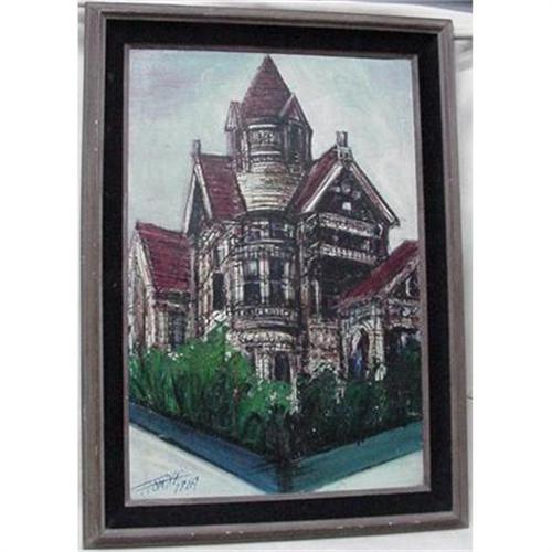 An oil painting of a multi gabled and turreted Victorian mansion. Large framed canvas, 30 1/2" X 43". Signed lower left as shown and dated 1969. Condition is very good.