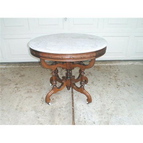 Here is a very attractive , walnut ( could be rosewood) , lamp table with a white, oval , marble top made about 1880. The bottom legs are very curvaceous with round, turned risers to give a great look. The table skirt is oval shaped with a carved raised center containing some banner carving. This carved oval skirt is similiar to Brooks tables built in New York City. Unfortunately, the table has no label but does have a pressed in makers number. The marble top is perfect with wear you would expect after 110 years of service. The brass and white glass casters are replacements. The table has an old refinish. This is a great looking table for a special place in home or office.