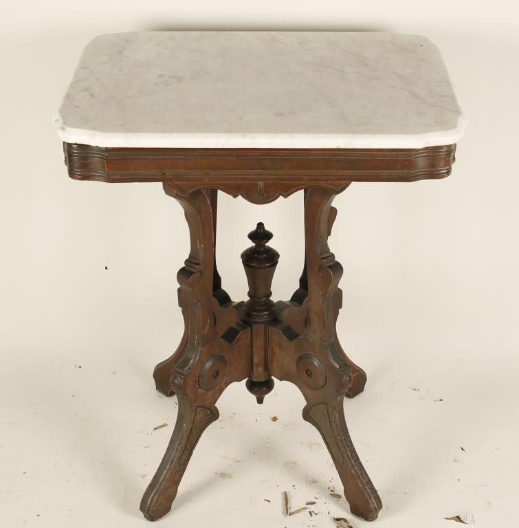 White marble top measures 18"x24". Dark wood scallops adorn the underside of the table with carved legs that have an urn perched at the bottom. 29" high.
