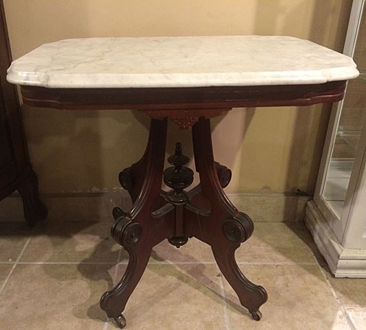 Victorian Walnut marble top table, nice turtle shaped marble, center finial, nice end table size. Measures approx. 26 1/2" wide x 26" tall x 19" deep.