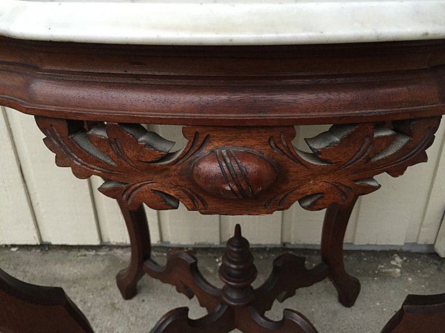Victorian Marble Top Table, c. 1860s, turtle top shape marble top table with oval egg carved ornate drops underneath the skirts. Has nice, original finial in base, nice white marble top, all original, beautiful finish. Measures approx. 30" long x 23" wide x 27 1/2" tall