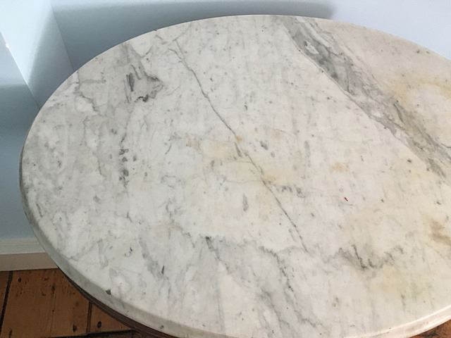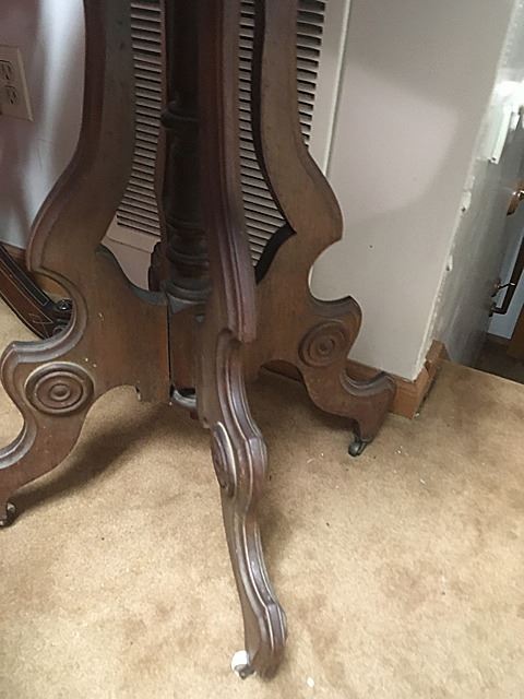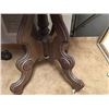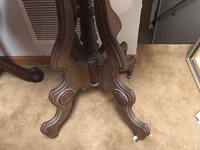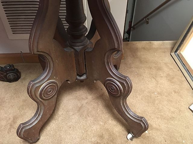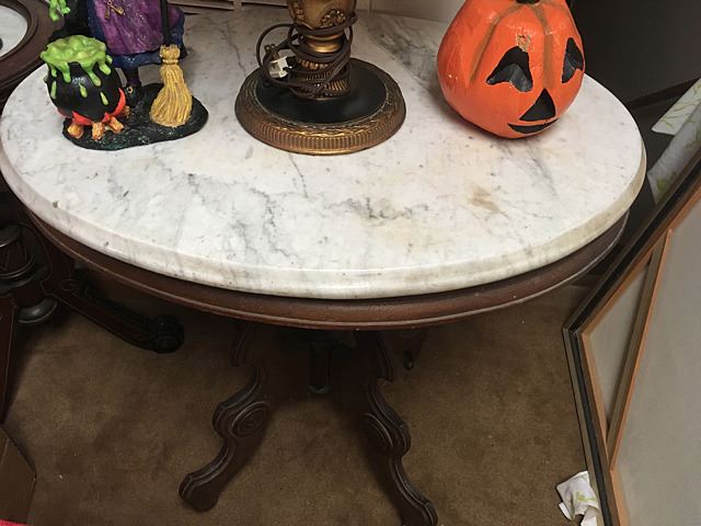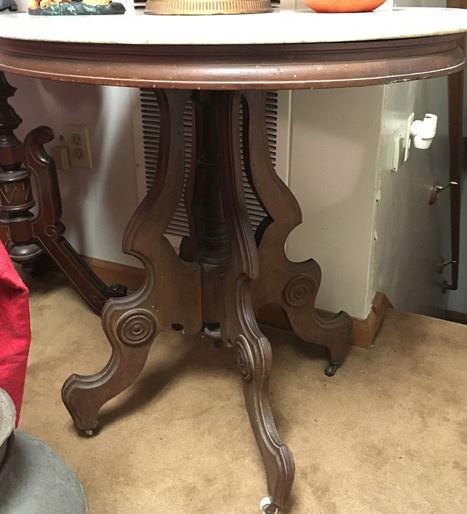 Victorian marble top table with oval white marble top, center column, with 4 carved legs. Measures approx. 29" high x 29" wide x 22" deep.