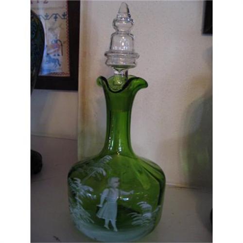 This is a more unusual form of Mary Gregory Glass. The decanter is closer to a dark chartreuse color with a clear stopper. It measures a total height of 11" and indicates a ground pontil, a good indication of its age. The white enameling is finely executed and illustrates a young girl holding a flower. The condition is good with no cracks or chips. The very tip of the stopper is a little rough but it could not be determined if this is a chip or just a roughness in the production of it. This decanter would be considered to be Victorian, not a new reproduction