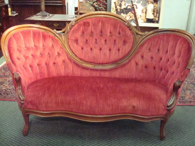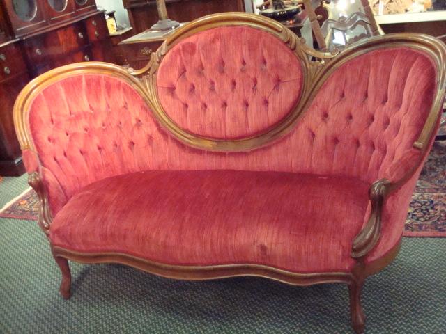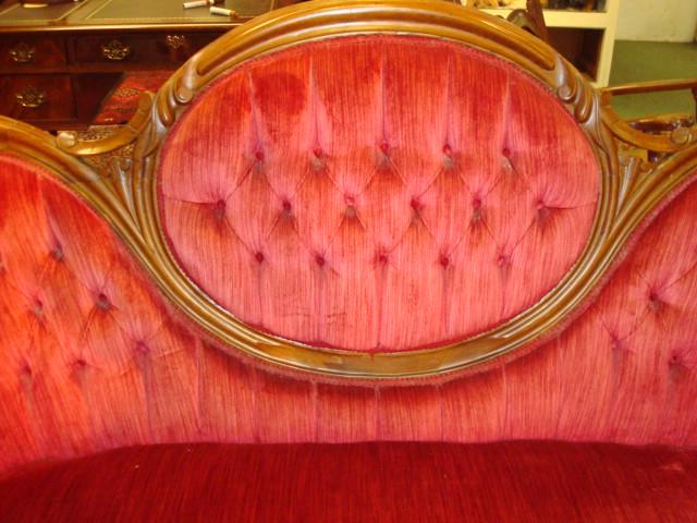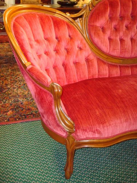 Victorian Medallion Back Button Tufted Red Sofa:6' Across Back. Serpentine Front Seat Rail, 41"T.Rococo Revival Style with Medallion Center and Fully Upholstered Side and Back. Light Wear. (200-400)