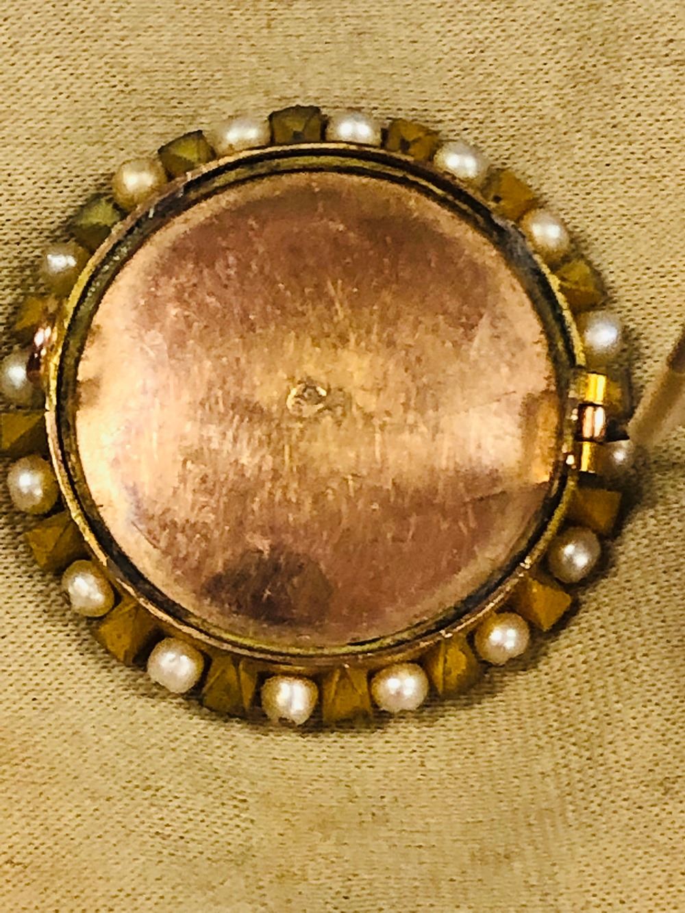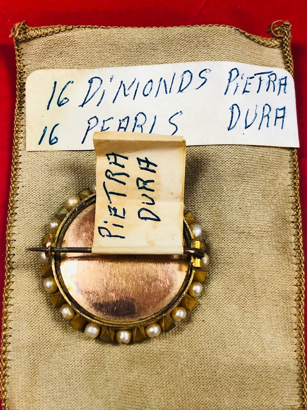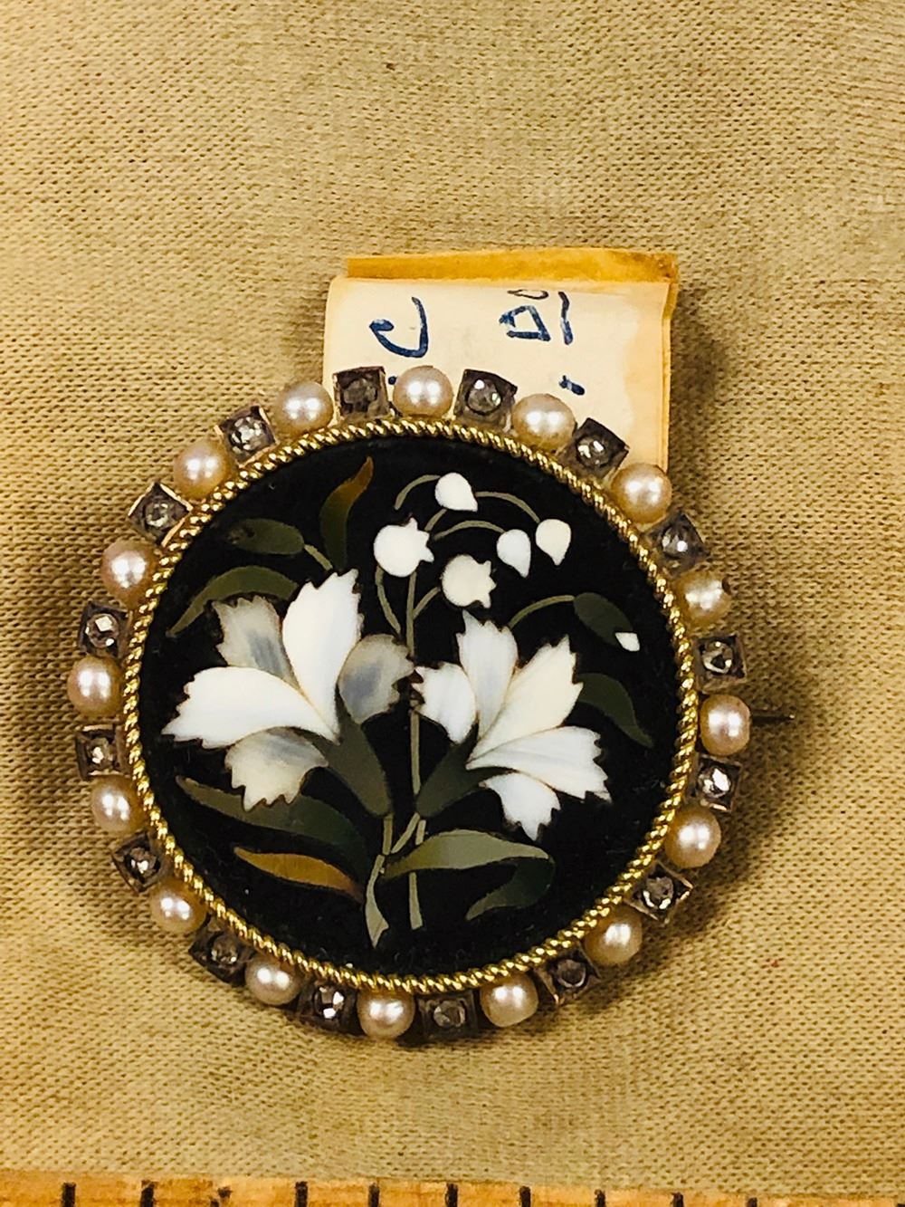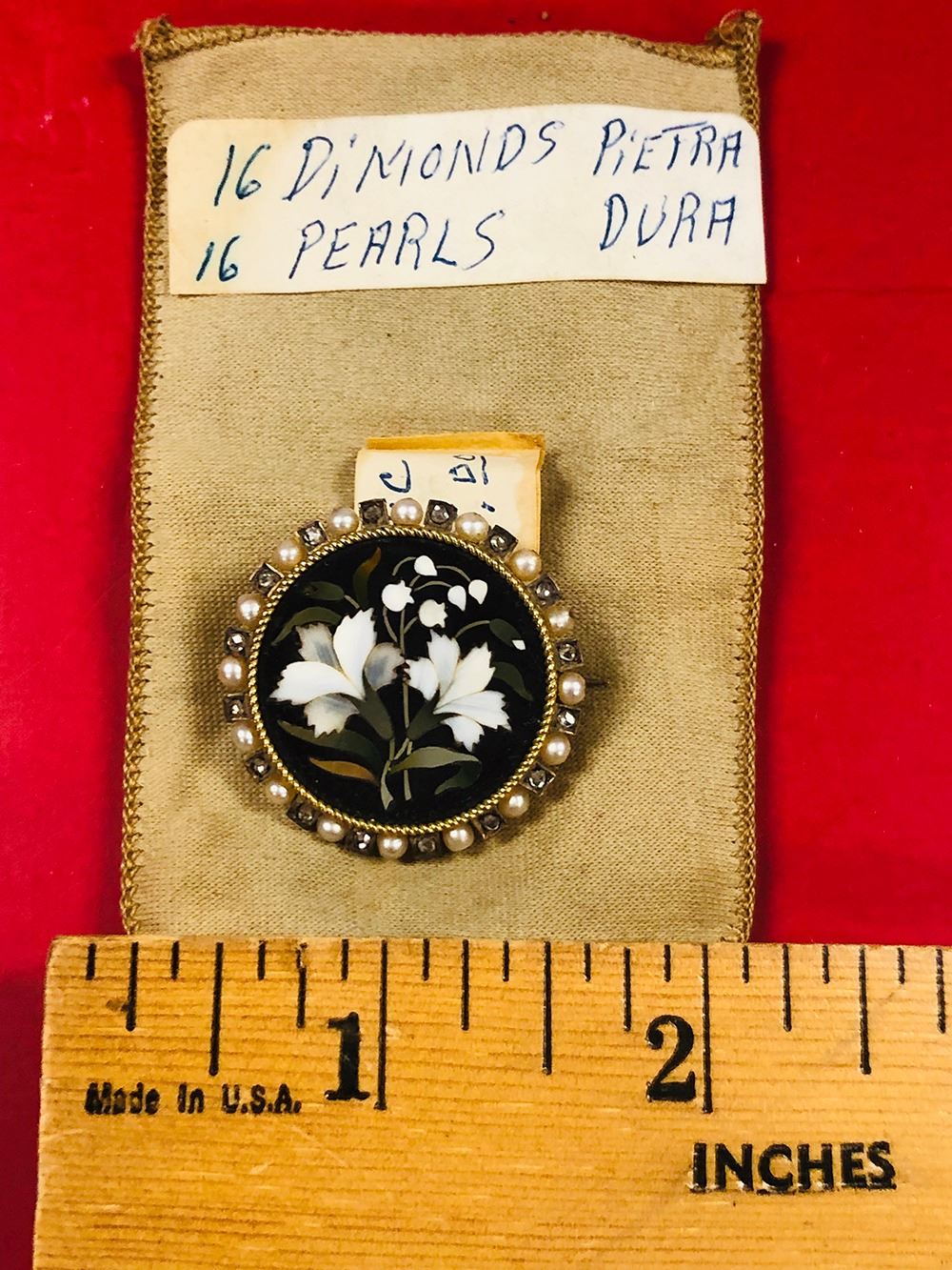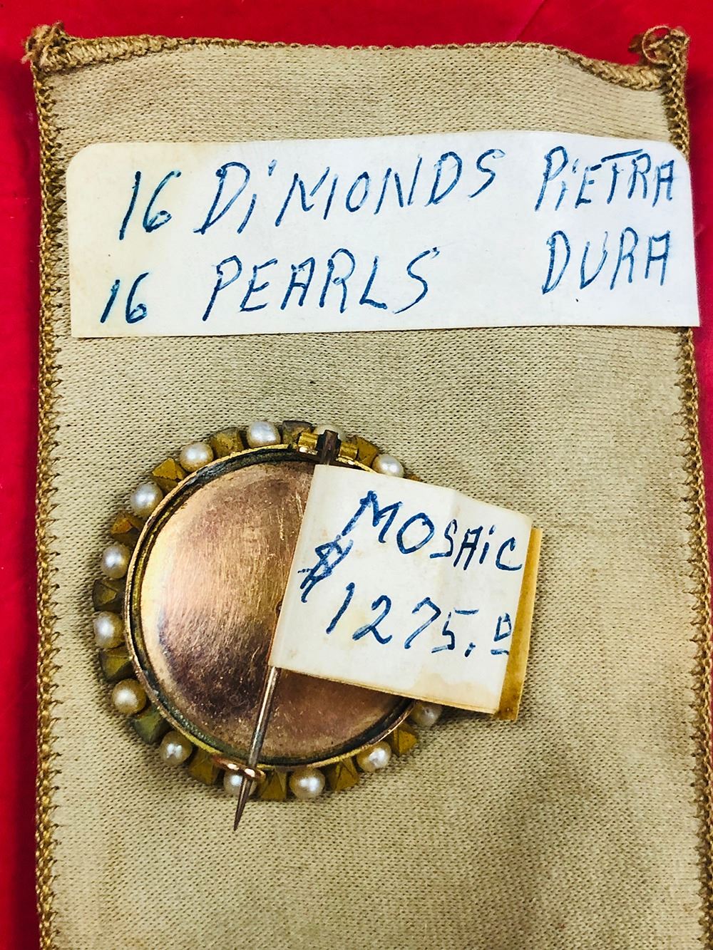VIctorian Micro Mosaic pin surrounded by 16 diamonds and 16 pearls, floral micro mosaic, rare find! Measures approx. 1 inch diameter, from the estate.