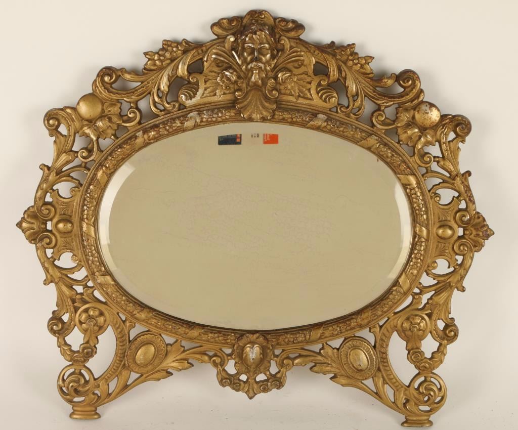 Oval beveled glass with a brass frame with the face of Bacchus and floral and damask motif. Very heavy, shows age. Approx. 16"x18"