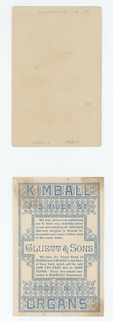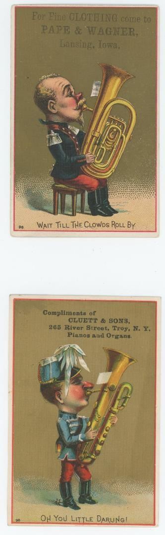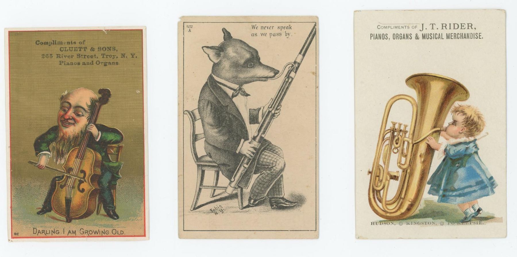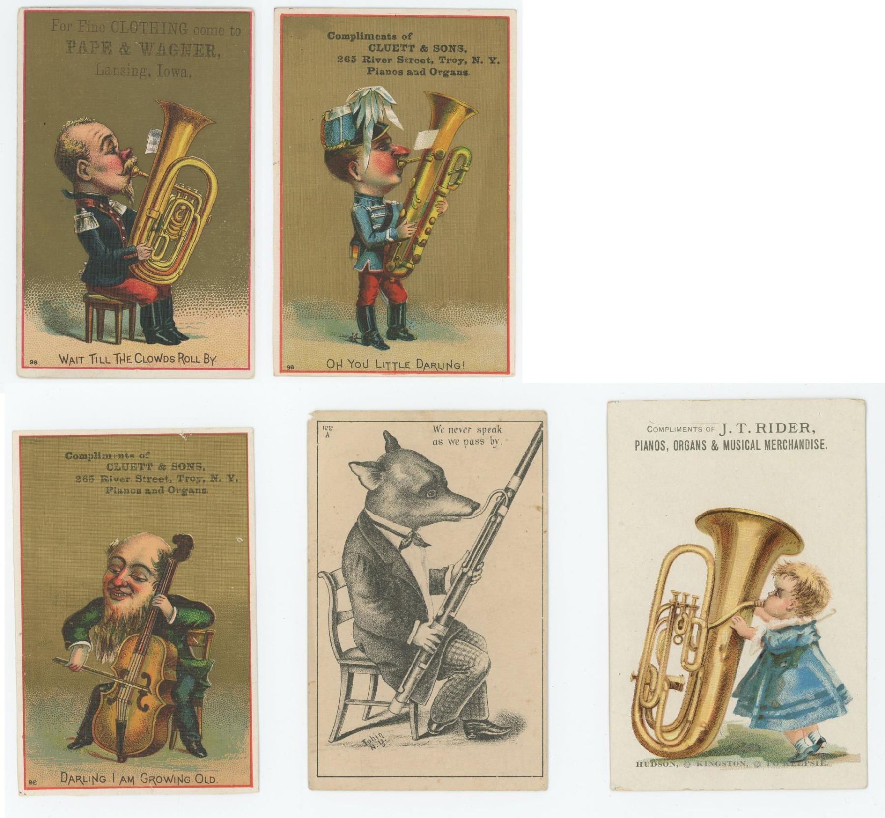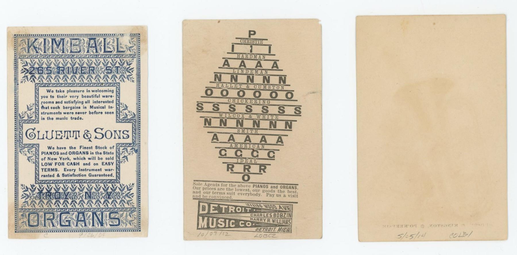 Largest is 3" by 4 7/8". The cards include advertisements for various companies, such as piano dealers and clothing stores such as J.T. Rider Pianos, Organs, & Musical Merchandise, Cluett & Sons, and Pape & Wagner.