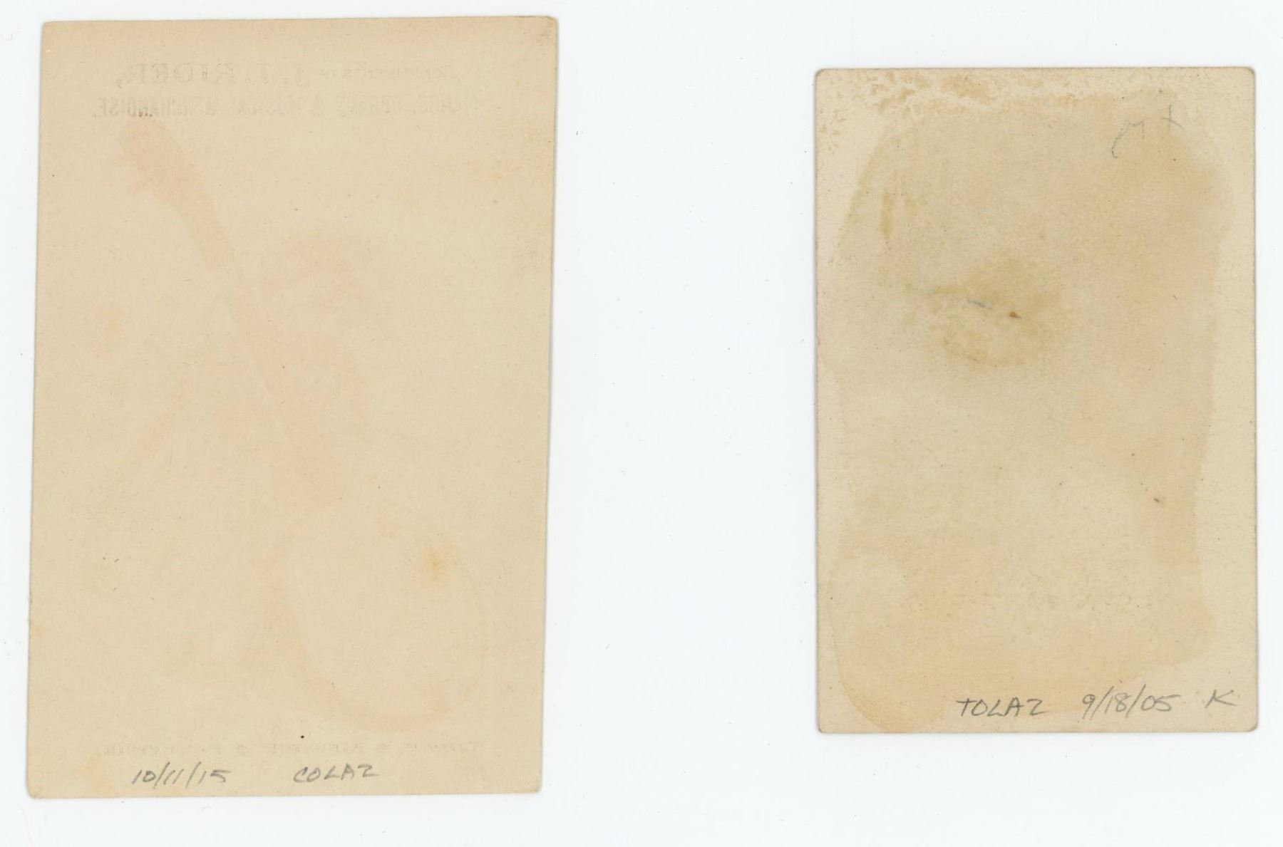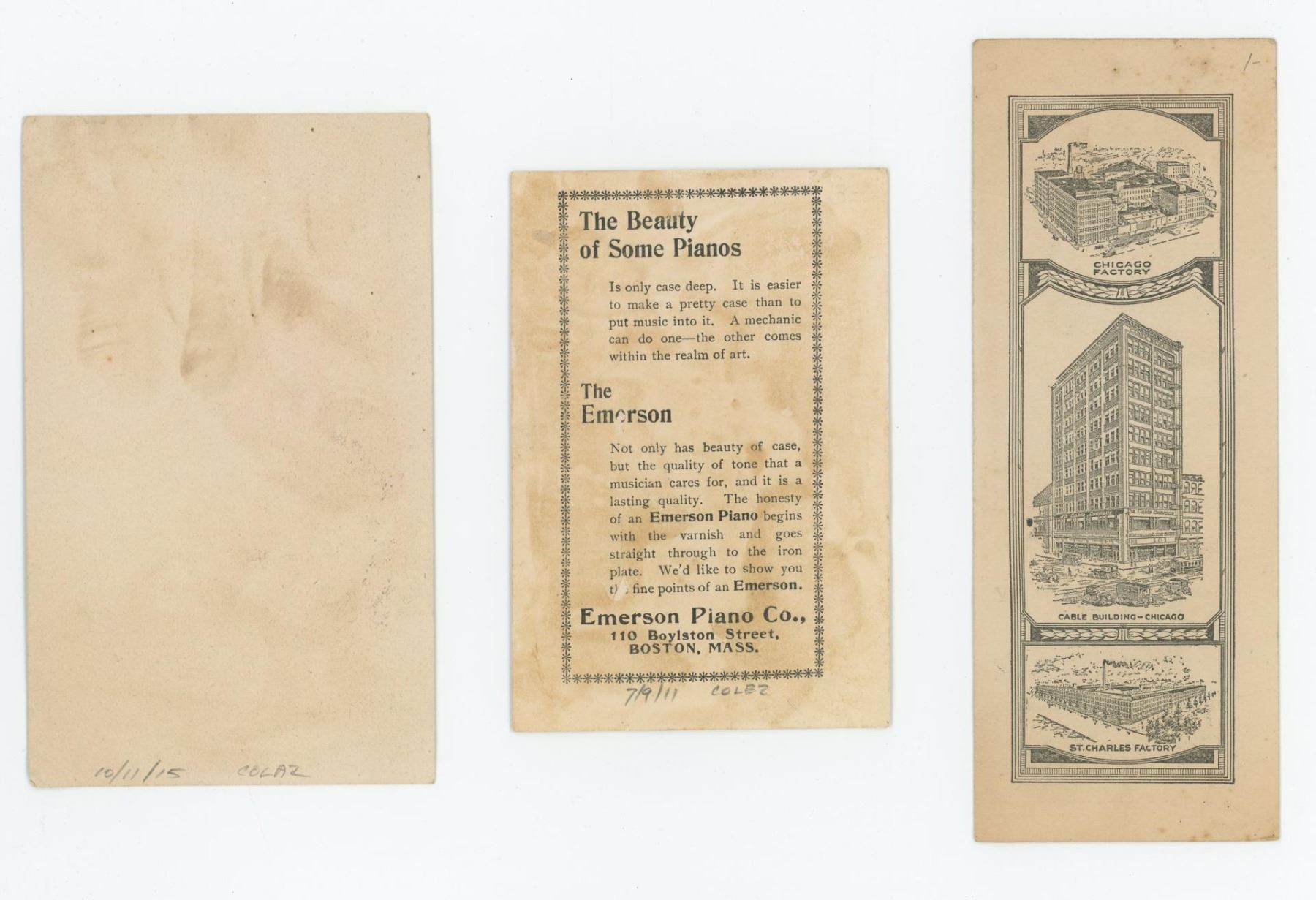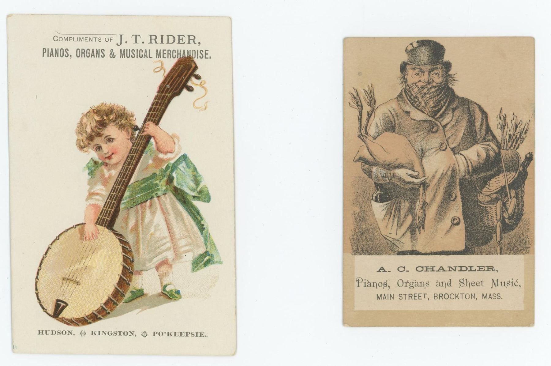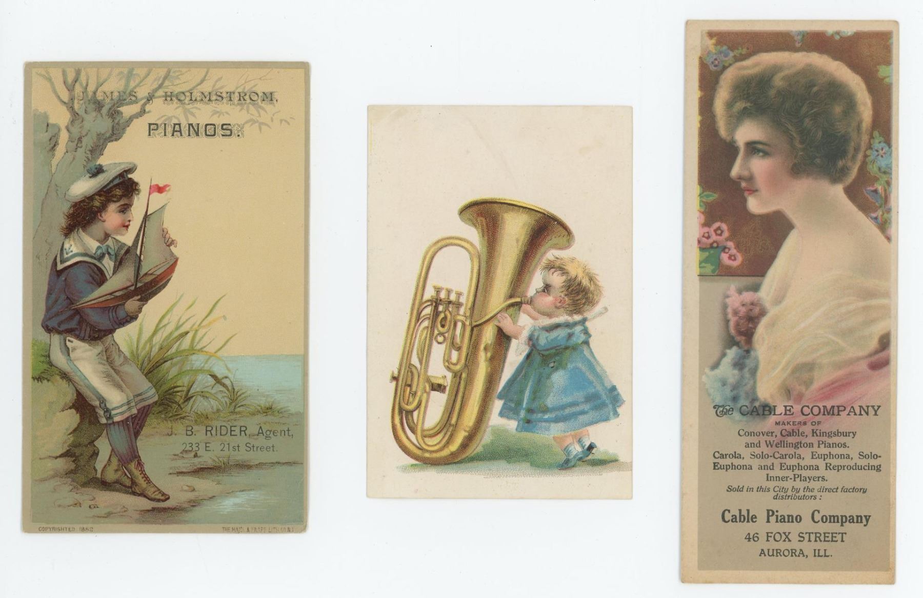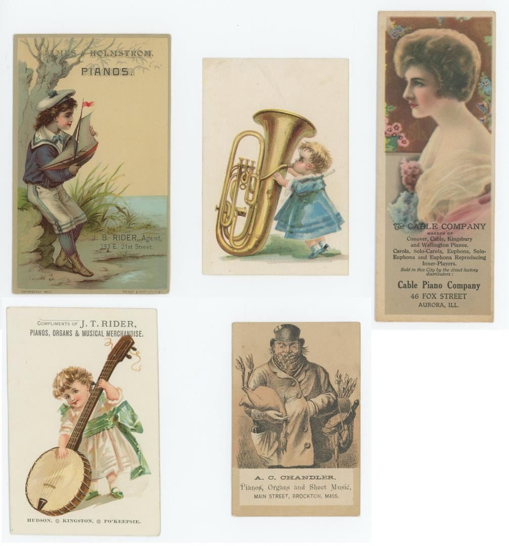 Largest is 2 1/2" by 6 1/4". Advertised companies include J.T. Rider Pianos & Organs, A.C. Chandler Music, and The Cable Company.