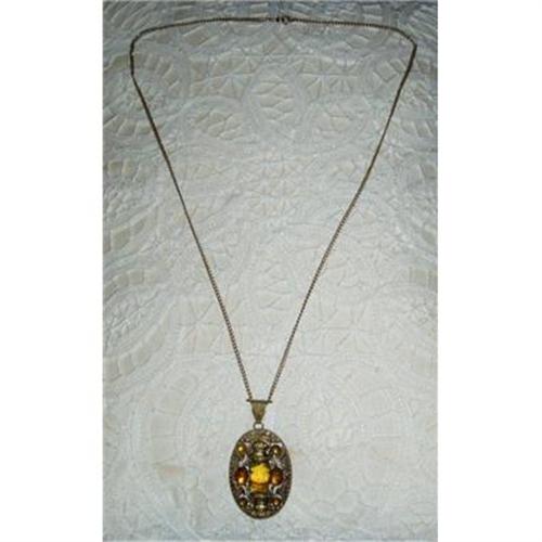 This necklace/pendant belonged to my Great Great Grandmother, it is an early Victorian brass filigree metal with amber colored stones, in very good/wearable condition. It measures 14.5" from end to end with a 2.25" drop.