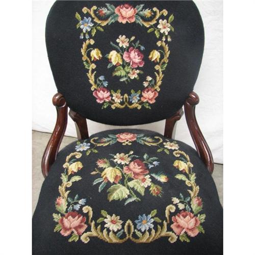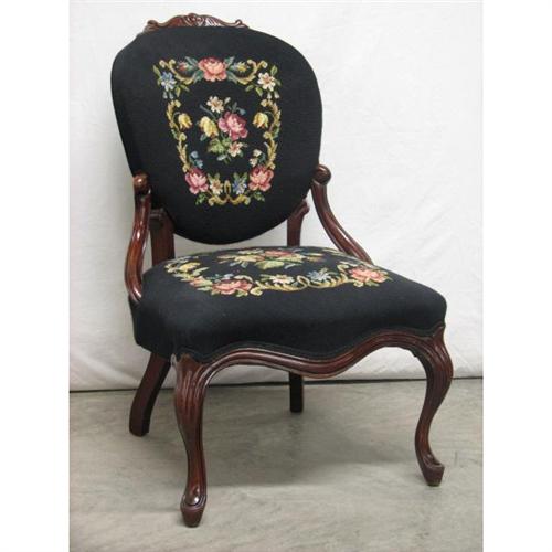Victorian Needlepoint Ladies Side Chair, Late 19th C. Features floral carved crest, serpentine seat, hip rests, Beautiful black with floral needlepoint upholstery. 36"H x 23"W across seat. Condition: no damage noted.