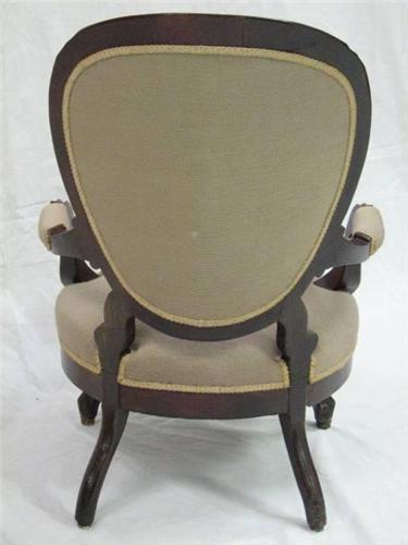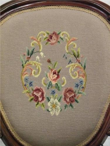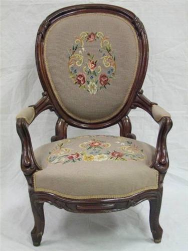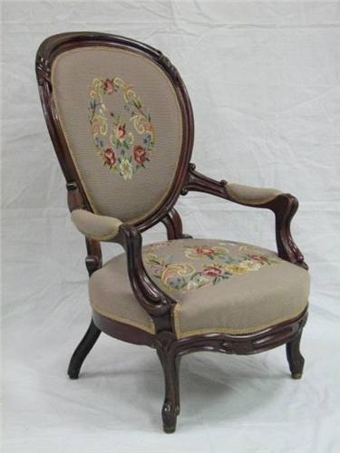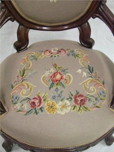 Circa 1840-1860 Victorian Needlepoint Parlour Chair, Rococo Revival, Mahogany. Features floral needlepoint back and seat with scroll carved walnut with padded scrolled arm supports and serpentine foliate carved seat rail on cabriole legs. Excellent condition. Dimensions: 36.5"H x 27"W x 34"D.