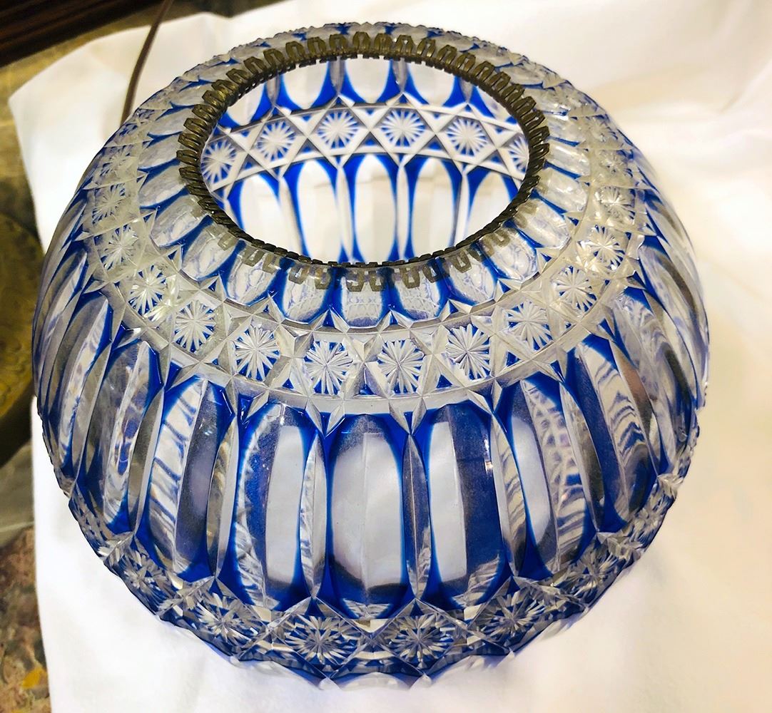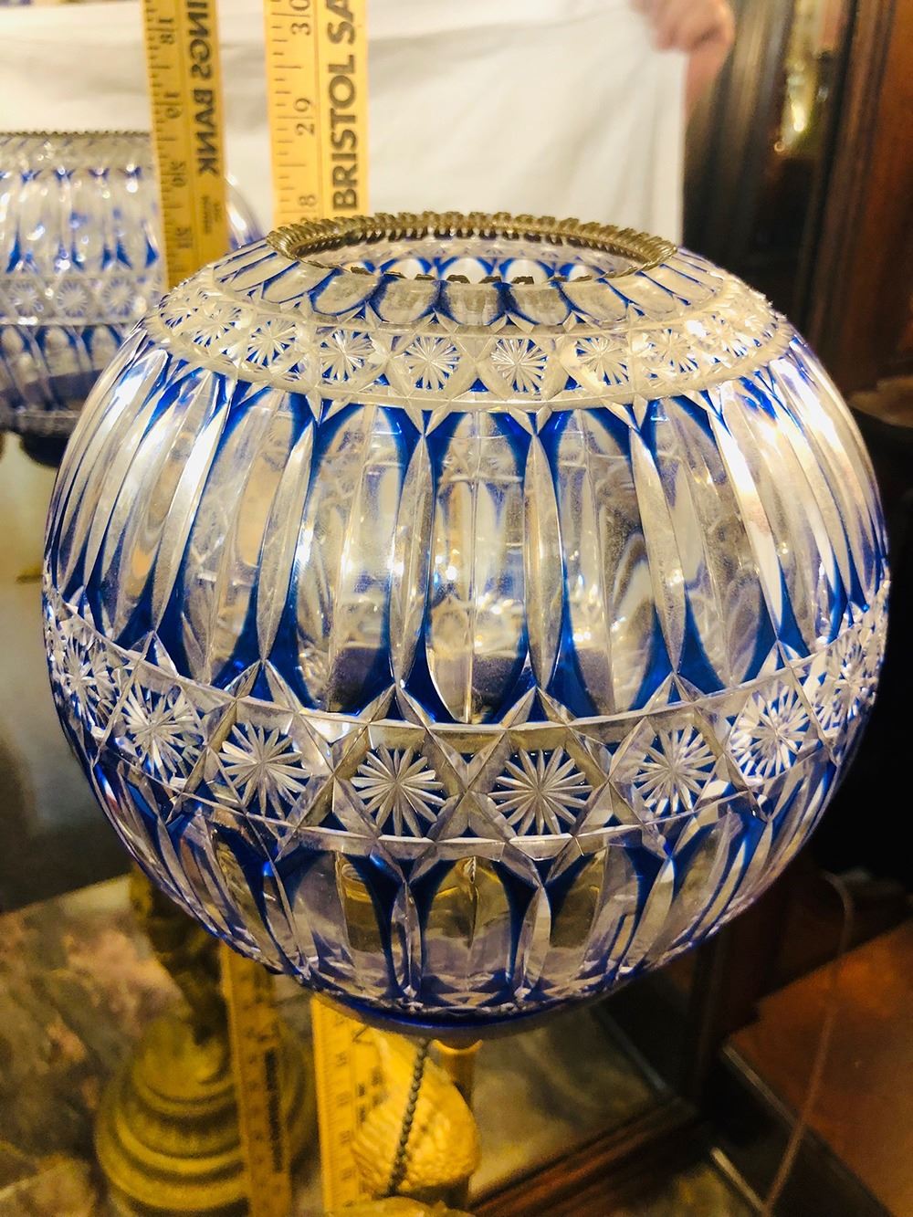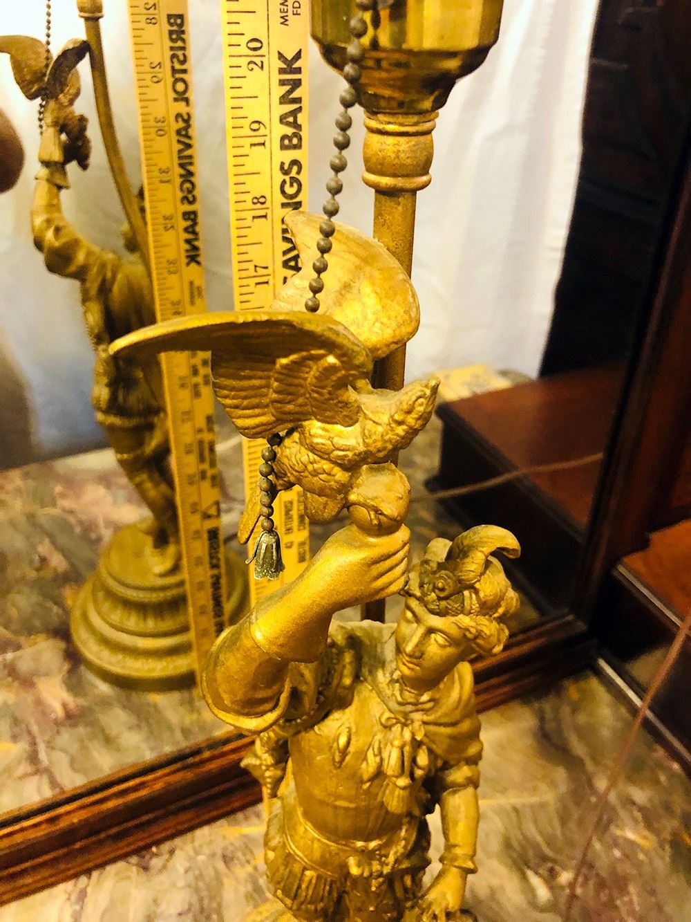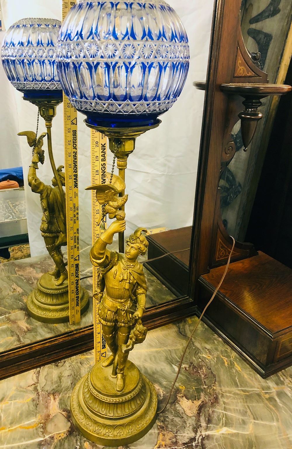 Victorian newel post lamp with beautiful blue cut glass globe. Measures approx. 29" tall.Figure is holding lamp with bird, cut glass globe is attributed to Piarpoint glass.Magnificent high style newel post lamp!