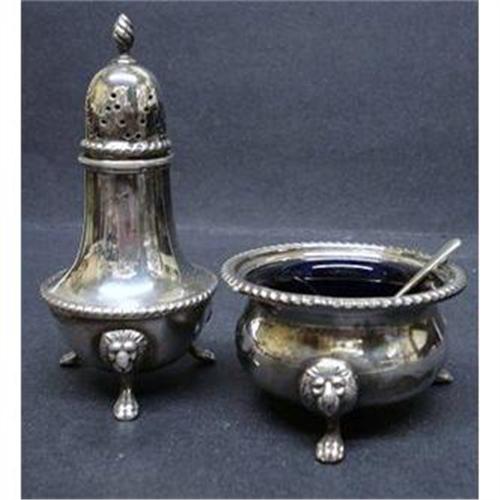 BEAUTIFUL VICTORIAN CONDIMENT SET - OPEN SALT CELLAR LINED WITH ORIGINAL CURVED COBALT BLUE GLASS AND TINY ORIGINAL SALT SPOON AND TALL MATCHING PEPPER SHAKER - BOTH PIECES STANDING ON TINY FEET THAT DEPICTS LIONS HEAD AND PAWS - as per images- the set is silverplated and made in england - salt cellar stands 1" high and 2 3/4" in diam.,Excellent condition - free from dents, or cracks, US Buyer to pay 7.00 for shipping plus insurance,THANKS.