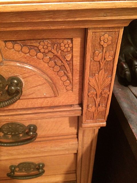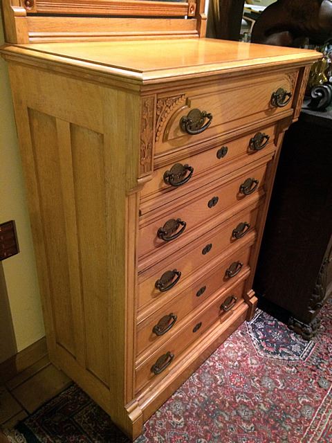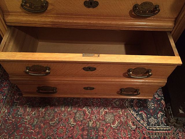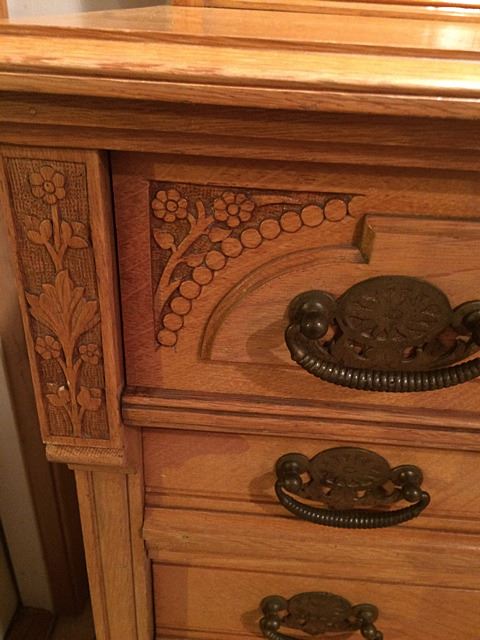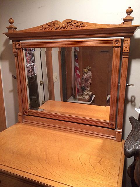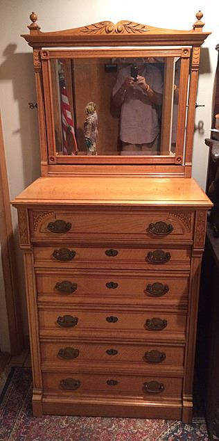 Victorian Gentlemen's chest in oak, which is unusual to find, has a beveled glass adjustable mirror, which men used for shaving, 6 drawers, with bottom drawer 2 deep, could have been made for top hats, wigs, etc. Has all the original brass hardware, original carved flowers at top left and right of drawers, solid oak, all there. Very very uncommon model to find in oak, many of these were made in dark woods like walnut or cherry, stunning example of Victorian Gentlemen's Chest.