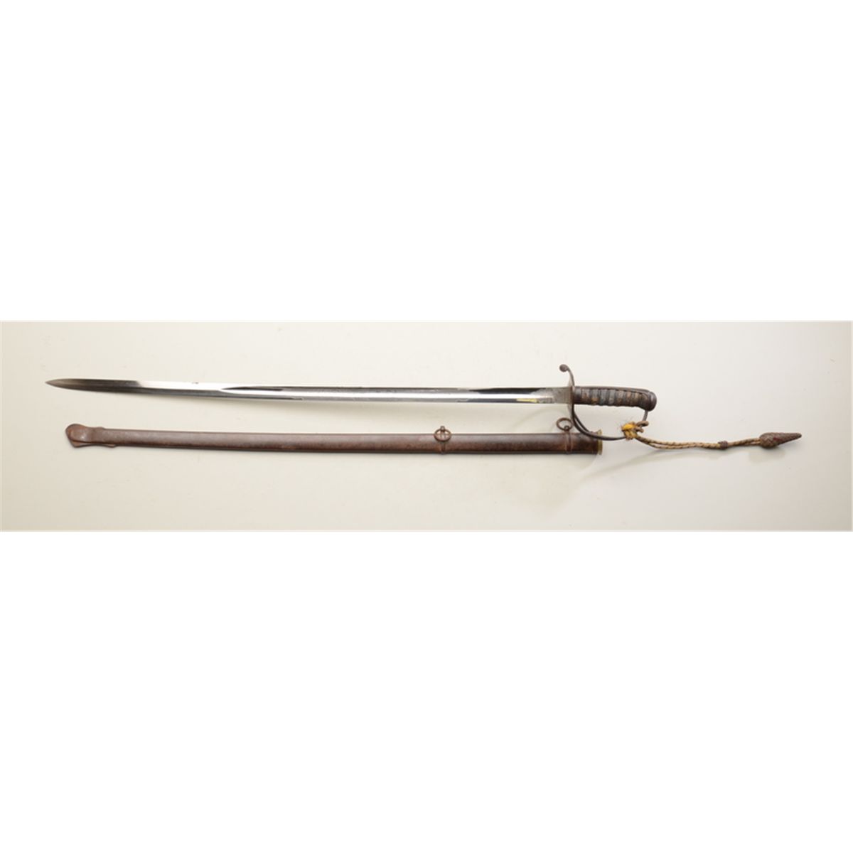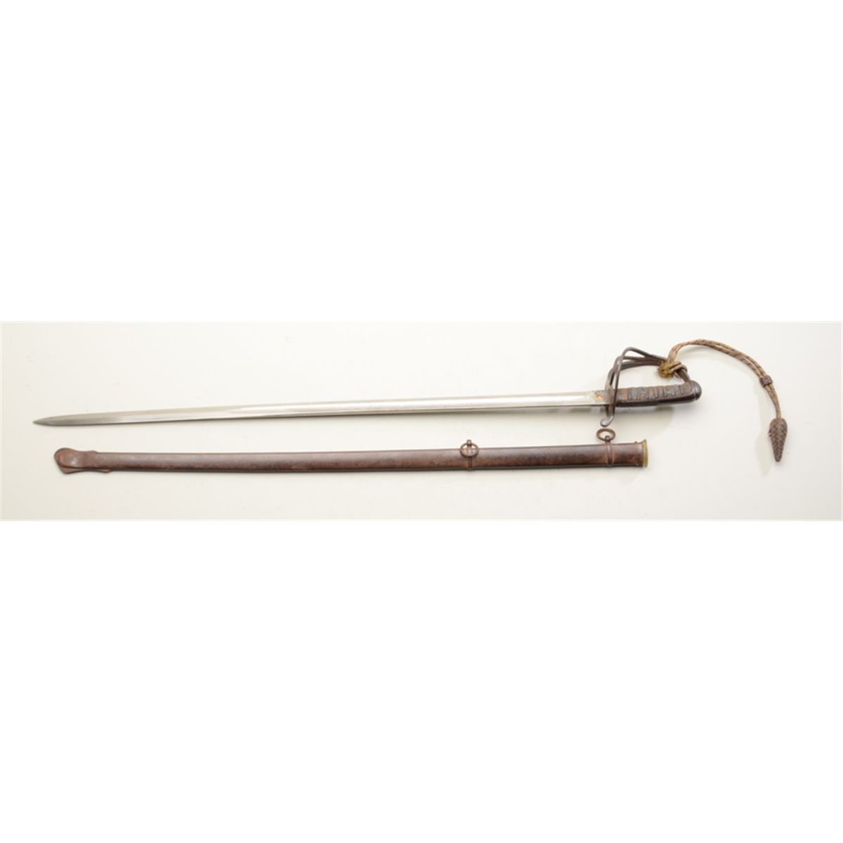 Victorian Officer’s British military sword and scabbard by Henry Wilkinson of London with fine etched blade; the scabbard and top end of the sword (grip and guard) have not faired as well, having suffered from exposure to the elements; scabbard has an even moderate coating of old rust and pitting; the guard and pommel also show pitting and a dark patina; the grip retains most of the wire wrap with considerable loss to the rayskin; with hanging knot and in out-of-the-attic condition. Est.: $300-$600.