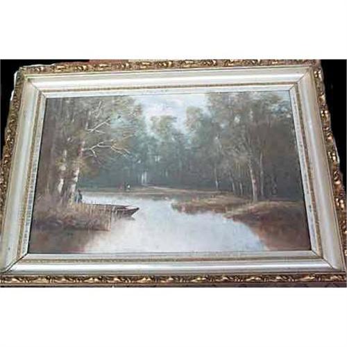 This large Oil painting has silver gilt over a gesso wooden frame of 3 " deep and 4" wide. There are some losses of decoration on the corners. The painting has a cracked surface, which is typical of its age. There are no losses of paint. This painting shows a man in a small boat going around the bend in the river with others watching from a distant shore.<p> If one has any further questions or would like us to supply other images of this article please don’t hesitate to email us. We will do our best to accommodate your request as soon as possible.